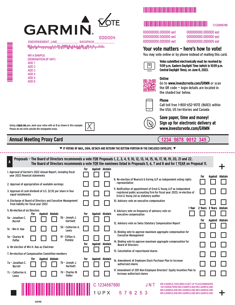 | 1. | Approval of Garmin’s 2022 Annual Report, including the consolidated financial statements of Garmin for the fiscal year ended December 31, 2022 and the statutory financial statements of Garmin for the fiscal year ended December 31, 2022 | |