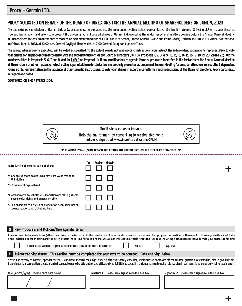 We cordially invite you to attend the 2023 Annual General Meeting (the “Annual Meeting”) of Shareholders of Garmin Ltd., a Swiss company (“Garmin” or the “Company”). The Annual Meeting will be held simultaneously at the offices of the law firm of Homburger Ltd, Prime Tower, Hardstrasse 201, 8005 Zurich, Switzerland, and at the offices of Garmin International, Inc., 1200 East 151st Street, Olathe, Kansas, 66062, USA, at 5:00 p.m. Central European Summer Time (10:00 a.m., U.S. Central Daylight Time) on Friday, June 9, 2023. The two locations will be linked via a live video and audio link. The purpose of the meeting is to consider and vote upon the following matters: