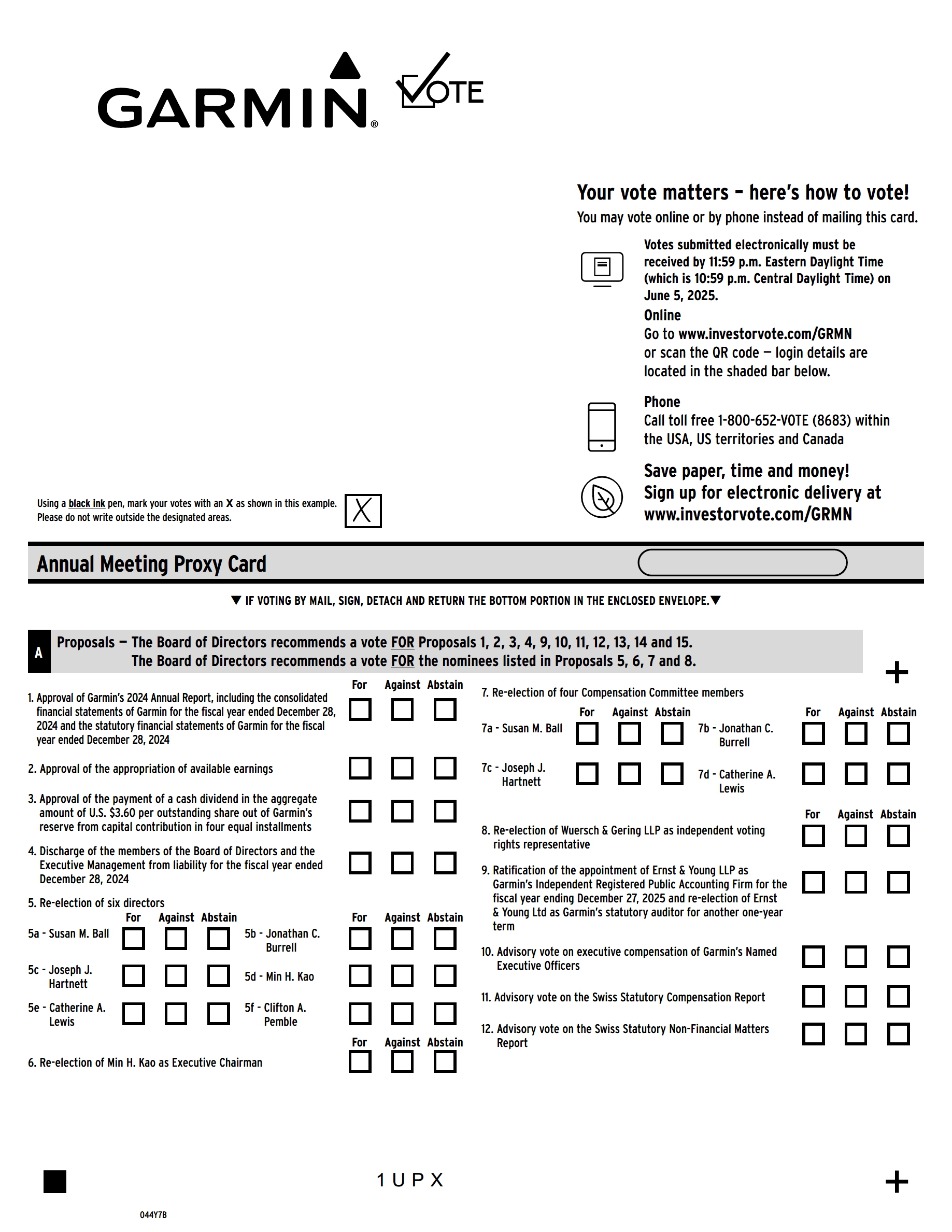 ENDORSEMENT_LINE SACKPACK MR A SAMPLE DESIGNATION (IF ANY) ADD 1 ADD 2 DD 3 ADD 4ADD 5 ADD 6 Using a black ink pen, mark your votes with an X as shown in this example. Please do not write outside the designated areas. C123456789 000000000.000000 ext 000000000.000000 ext 000000000.000000 ext 000000000.000000 ext 000000000.000000 ext 000000000.000000 ext Your vote matters - here’s how to vote! You may vote online or by phone instead of mailing this card. Votes submitted electronically must be received by 11:59 p.m. Eastern Daylight Time (which is 10:59 p.m. Central Daylight Time) on June 5, 2025. Online Go to www.investorvote.com/GRMNor scan the QR code - login details are located in the shaded bar below. Phone Call toll free 1-800-652-VOTE (8683) within the USA, US territories and Canada Save paper, time and money! Sign up for electronic delivery at www.investorvote.com/GRMN Annual Meeting Proxy Card 1234 5678 9012 345 IF VOTING BY MAIL, SIGN, DETACH AND RETURN THE BOTTOM PORTION IN THE ENCLOSED ENVELOPE. A Proposals - The Board of Directors recommends a vote FOR Proposals 1, 2, 3, 4, 9, 10, 11, 12, 13, 14 and 15.The Board of Directors recommends a vote FOR the nominees listed in Proposals 5, 6, 7 and 8. 1. Approval of Garmin’s 2024 Annual Report, including the consolidated financial statements of Garmin for the fiscal year ended December 28, 2024 and the statutory financial statements of Garmin for the fiscal year ended December 28, 2024 2. Approval of the appropriation of available earnings 3. Approval of the payment of a cash dividend in the aggregate amount of U.S. $3.60 per outstanding share out of Garmin’s reserve from capital contribution in four equal instalments 4. Discharge of the members of the Board of Directors and the Executive Management from liability for the fiscal year ended December 28, 2024 5. Re-election of six directors 5a - Susan M. Ball 5b - Jonathan C. Burrell 5c - Joseph J. Hartnett 5d - Min H. Kao For Against Abstain For Against Abstain 5e - Catherine A. Lewis 5f - Clifton A. Pemble For Against Abstain 6. Re-election of Min H. Kao as Executive Chairman 7a - Susan M. Ball 7b - Jonathan C. Burrell 7c - Joseph J. Hartnett 7d - Catherine A. Lewis 8. Re-election of Wuersch & Gering LLP as independent voting rights representative 9. Ratification of the appointment of Ernst & Young LLP as Garmin’s Independent Registered Public Accounting Firm for the fiscal year ending December 27, 2025 and re-election of Ernst & Young Ltd as Garmin’s statutory auditor for another one-year term 10. Advisory vote on executive compensation of Garmin’s Named Executive Officers 11. Advisory vote on the Swiss Statutory Compensation Report 12. Advisory vote on the Swiss Statutory Non-Financial Matters Report For Against Abstain For Against Abstain For Against Abstain For Against Abstain C 1234567890 1UPX 647417 J N T MR A SAMPLE (THIS AREA IS SET UP TO ACCOMMODATE 140 CHARACTERS) MR A SAMPLE AND MR A SAMPLE AND MR A SAMPLE AND MR A SAMPLE AND MR A SAMPLE AND MR A SAMPLE AND MR A SAMPLE AND MR A SAMPLE AND 044Y7B