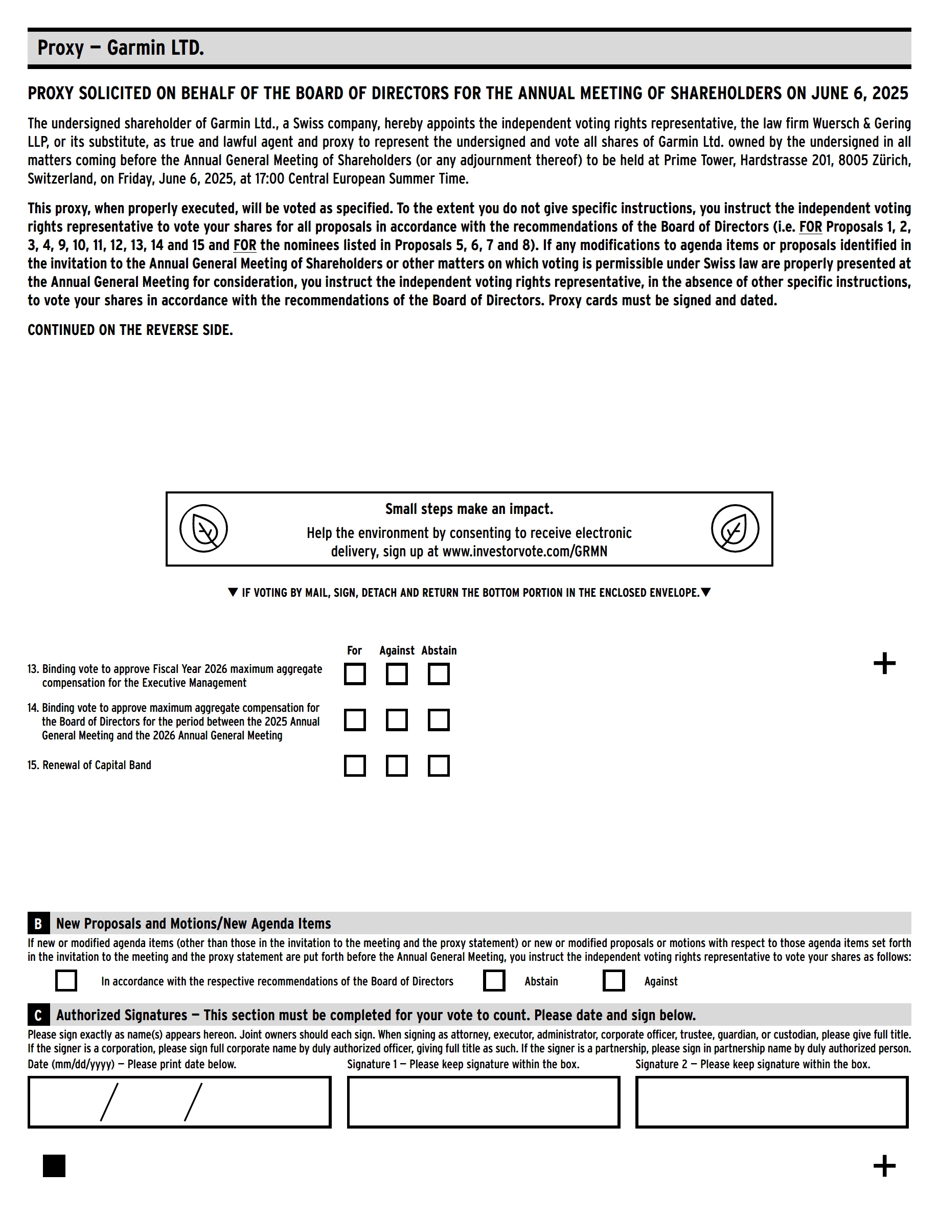 Proxy - Garmin LTD. PROXY SOLICITED ON BEHALF OF THE BOARD OF DIRECTORS FOR THE ANNUAL MEETING OF SHAREHOLDERS ON JUNE 6, 2025 The undersigned shareholder of Garmin Ltd., a Swiss company, hereby appoints the independent voting rights representative, the law firm Wuersch & Gering LLP, or its substitute, as true and lawful agent and proxy to represent the undersigned and vote all shares of Garmin Ltd. owned by the undersigned in all matters coming before the Annual General Meeting of Shareholders (or any adjournment thereof) to be held at Prime Tower, Hardstrasse 201, 8005 Zürich, Switzerland, on Friday, June 6, 2025, at 17:00 Central European Summer Time. This proxy, when properly executed, will be voted as specified. To the extent you do not give specific instructions, you instruct the independent voting rights representative to vote your shares for all proposals in accordance with the recommendations of the Board of Directors (i.e. FOR Proposals 1, 2, 3, 4, 9, 10, 11, 12, 13, 14 and 15 and FOR the nominees listed in Proposals 5, 6, 7 and 8). If any modifications to agenda items or proposals identified in the invitation to the Annual General Meeting of Shareholders or other matters on which voting is permissible under Swiss law are properly presented at the Annual General Meeting for consideration, you instruct the independent voting rights representative, in the absence of other specific instructions, to vote your shares in accordance with the recommendations of the Board of Directors. Proxy cards must be signed and dated. CONTINUED ON THE REVERSE SIDE. Small steps make an impact. Help the environment by consenting to receive electronic delivery, sign up at www.investorvote.com/GRMN IF VOTING BY MAIL, SIGN, DETACH AND RETURN THE BOTTOM PORTION IN THE ENCLOSED ENVELOPE 13. Binding vote to approve Fiscal Year 2026 maximum aggregate compensation for the Executive Management 14. Binding vote to approve maximum aggregate compensation for the Board of Directors for the period between the 2025 Annual General Meeting and the 2026 Annual General Meeting 15. Renewal of Capital Band For Against Abstain B New Proposals and Motions/New Agenda Items If new or modified agenda items (other than those in the invitation to the meeting and the proxy statement) or new or modified proposals or motions with respect to those agenda items set forth in the invitation to the meeting and the proxy statement are put forth before the Annual General Meeting, you instruct the independent voting rights representative to vote your shares as follows: In accordance with the respective recommendations of the Board of Directors Abstain Against C Authorized Signatures - This section must be completed for your vote to count. Please date and sign below. Please sign exactly as name(s) appears hereon. Joint owners should each sign. When signing as attorney, executor, administrator, corporate officer, trustee, guardian, or custodian, please give full title. If the signer is a corporation, please sign full corporate name by duly authorized officer, giving full title as such. If the signer is a partnership, please sign in partnership name by duly authorized person. Signature 1 - Please keep signature within the box. Signature 2 - Please keep signature within the box. Date (mm/dd/yyyy) - Please print date below.