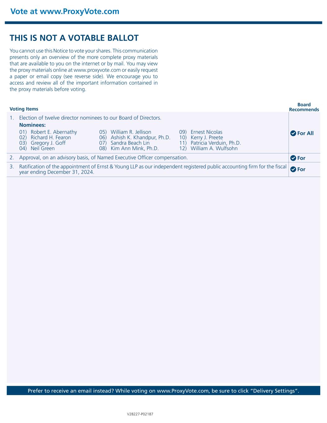 THIS IS NOT A VOTABLE BALLOT You cannot use this Notice to vote your shares. This communication  presents only an overview of the more complete proxy materials  that are available to you on the internet or by mail. You may view  the proxy materials online at www.proxyvote.com or easily request  a paper or email copy (see reverse side). We encourage you to  access and review all of the important information contained in  the proxy materials before voting. Vote at www.ProxyVote.com Prefer to receive an email instead? While voting on www.ProxyVote.com, be sure to click “Delivery Settings”. Voting Items Board  Recommends V28227-P02187  01) Robert E. Abernathy  02) Richard H. Fearon  03) Gregory J. Goff  04) Neil Green  05) William R. Jellison  06) Ashish K. Khandpur, Ph.D. 07) Sandra Beach Lin  08) Kim Ann Mink, Ph.D. 09) Ernest Nicolas 10) Kerry J. Preete 11) Patricia Verduin, Ph.D. 12) William A. Wulfsohn 1. Election of twelve director nominees to our Board of Directors.  Nominees: 2. Approval, on an advisory basis, of Named Executive Officer compensation. 3. Ratification of the appointment of Ernst & Young LLP as our independent registered public accounting firm for the fiscal  year ending December 31, 2024. For All For For