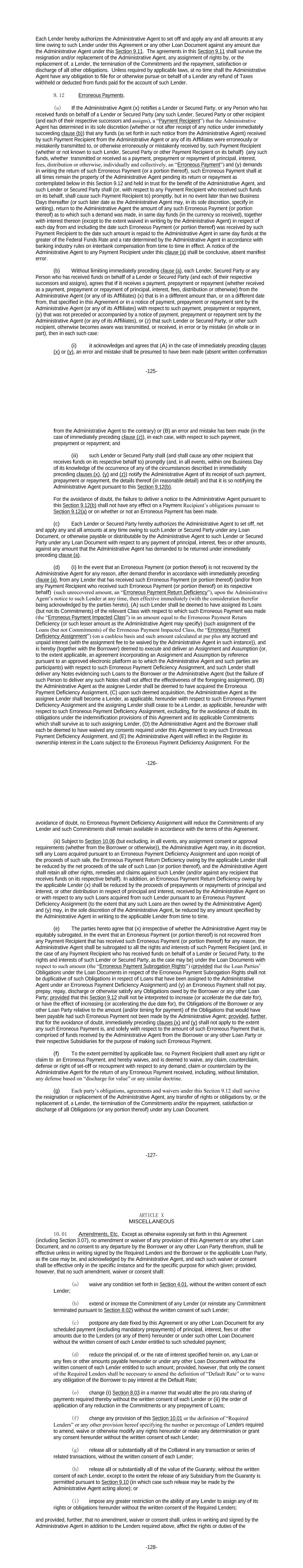 -125- Each Lender hereby authorizes the Administrative Agent to set off and apply any and all amounts at any time owing to such Lender under this Agreement or any other Loan Document against any amount due the Administrative Agent under this Section 9.11. The agreements in this Section 9.11 shall survive the resignation and/or replacement of the Administrative Agent, any assignment of rights by, or the replacement of, a Lender, the termination of the Commitments and the repayment, satisfaction or discharge of all other obligations. Unless required by applicable laws, at no time shall the Administrative Agent have any obligation to file for or otherwise pursue on behalf of a Lender any refund of Taxes withheld or deducted from funds paid for the account of such Lender. 9.12 Erroneous Payments. (a) If the Administrative Agent (x) notifies a Lender or Secured Party, or any Person who has received funds on behalf of a Lender or Secured Party (any such Lender, Secured Party or other recipient (and each of their respective successors and assigns), a “Payment Recipient”) that the Administrative Agent has determined in its sole discretion (whether or not after receipt of any notice under immediately succeeding clause (b)) that any funds (as set forth in such notice from the Administrative Agent) received by such Payment Recipient from the Administrative Agent or any of its Affiliates were erroneously or mistakenly transmitted to, or otherwise erroneously or mistakenly received by, such Payment Recipient (whether or not known to such Lender, Secured Party or other Payment Recipient on its behalf) (any such funds, whether transmitted or received as a payment, prepayment or repayment of principal, interest, fees, distribution or otherwise, individually and collectively, an “Erroneous Payment”) and (y) demands in writing the return of such Erroneous Payment (or a portion thereof), such Erroneous Payment shall at all times remain the property of the Administrative Agent pending its return or repayment as contemplated below in this Section 9.12 and held in trust for the benefit of the Administrative Agent, and such Lender or Secured Party shall (or, with respect to any Payment Recipient who received such funds on its behalf, shall cause such Payment Recipient to) promptly, but in no event later than two Business Days thereafter (or such later date as the Administrative Agent may, in its sole discretion, specify in writing), return to the Administrative Agent the amount of any such Erroneous Payment (or portion thereof) as to which such a demand was made, in same day funds (in the currency so received), together with interest thereon (except to the extent waived in writing by the Administrative Agent) in respect of each day from and including the date such Erroneous Payment (or portion thereof) was received by such Payment Recipient to the date such amount is repaid to the Administrative Agent in same day funds at the greater of the Federal Funds Rate and a rate determined by the Administrative Agent in accordance with banking industry rules on interbank compensation from time to time in effect. A notice of the Administrative Agent to any Payment Recipient under this clause (a) shall be conclusive, absent manifest error. (b) Without limiting immediately preceding clause (a), each Lender, Secured Party or any Person who has received funds on behalf of a Lender or Secured Party (and each of their respective successors and assigns), agrees that if it receives a payment, prepayment or repayment (whether received as a payment, prepayment or repayment of principal, interest, fees, distribution or otherwise) from the Administrative Agent (or any of its Affiliates) (x) that is in a different amount than, or on a different date from, that specified in this Agreement or in a notice of payment, prepayment or repayment sent by the Administrative Agent (or any of its Affiliates) with respect to such payment, prepayment or repayment, (y) that was not preceded or accompanied by a notice of payment, prepayment or repayment sent by the Administrative Agent (or any of its Affiliates), or (z) that such Lender or Secured Party, or other such recipient, otherwise becomes aware was transmitted, or received, in error or by mistake (in whole or in part), then in each such case: (i) it acknowledges and agrees that (A) in the case of immediately preceding clauses (x) or (y), an error and mistake shall be presumed to have been made (absent written confirmation -126- from the Administrative Agent to the contrary) or (B) an error and mistake has been made (in the case of immediately preceding clause (z)), in each case, with respect to such payment, prepayment or repayment; and (ii) such Lender or Secured Party shall (and shall cause any other recipient that receives funds on its respective behalf to) promptly (and, in all events, within one Business Day of its knowledge of the occurrence of any of the circumstances described in immediately preceding clauses (x), (y) and (z)) notify the Administrative Agent of its receipt of such payment, prepayment or repayment, the details thereof (in reasonable detail) and that it is so notifying the Administrative Agent pursuant to this Section 9.12(b). For the avoidance of doubt, the failure to deliver a notice to the Administrative Agent pursuant to this Section 9.12(b) shall not have any effect on a Payment Recipient’s obligations pursuant to Section 9.12(a) or on whether or not an Erroneous Payment has been made. (c) Each Lender or Secured Party hereby authorizes the Administrative Agent to set off, net and apply any and all amounts at any time owing to such Lender or Secured Party under any Loan Document, or otherwise payable or distributable by the Administrative Agent to such Lender or Secured Party under any Loan Document with respect to any payment of principal, interest, fees or other amounts, against any amount that the Administrative Agent has demanded to be returned under