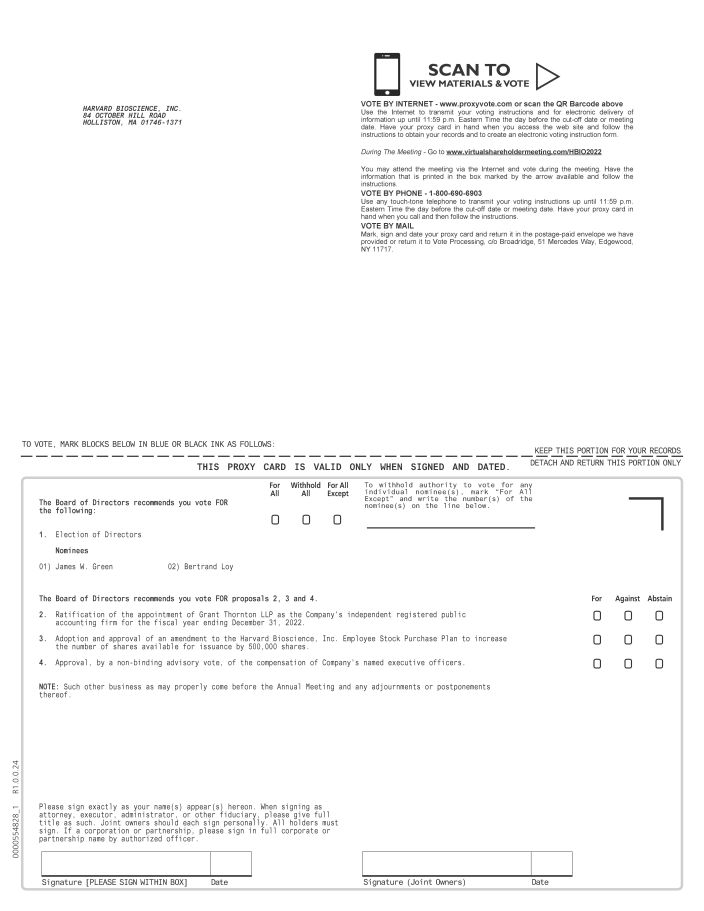 You are cordially invited to attend the 2022 Annual Meeting of Stockholders of Harvard Bioscience, Inc. (the “Annual Meeting”) to be held on Tuesday, May 17, 2022 at 11:00 a.m. EDT. The Annual Meeting will be held by virtual meeting only. You will not be able to attend the Annual Meeting in person. To be admitted to the Annual Meeting at http://www.virtualshareholdermeeting.com/HBIO2022, you must enter the control number found on your proxy card, voting instruction form or notice you previously received. You may vote during the Annual Meeting by following the instructions available on the meeting website during the meeting. At the meeting, we will be voting on the matters described in the accompanying proxy statement.