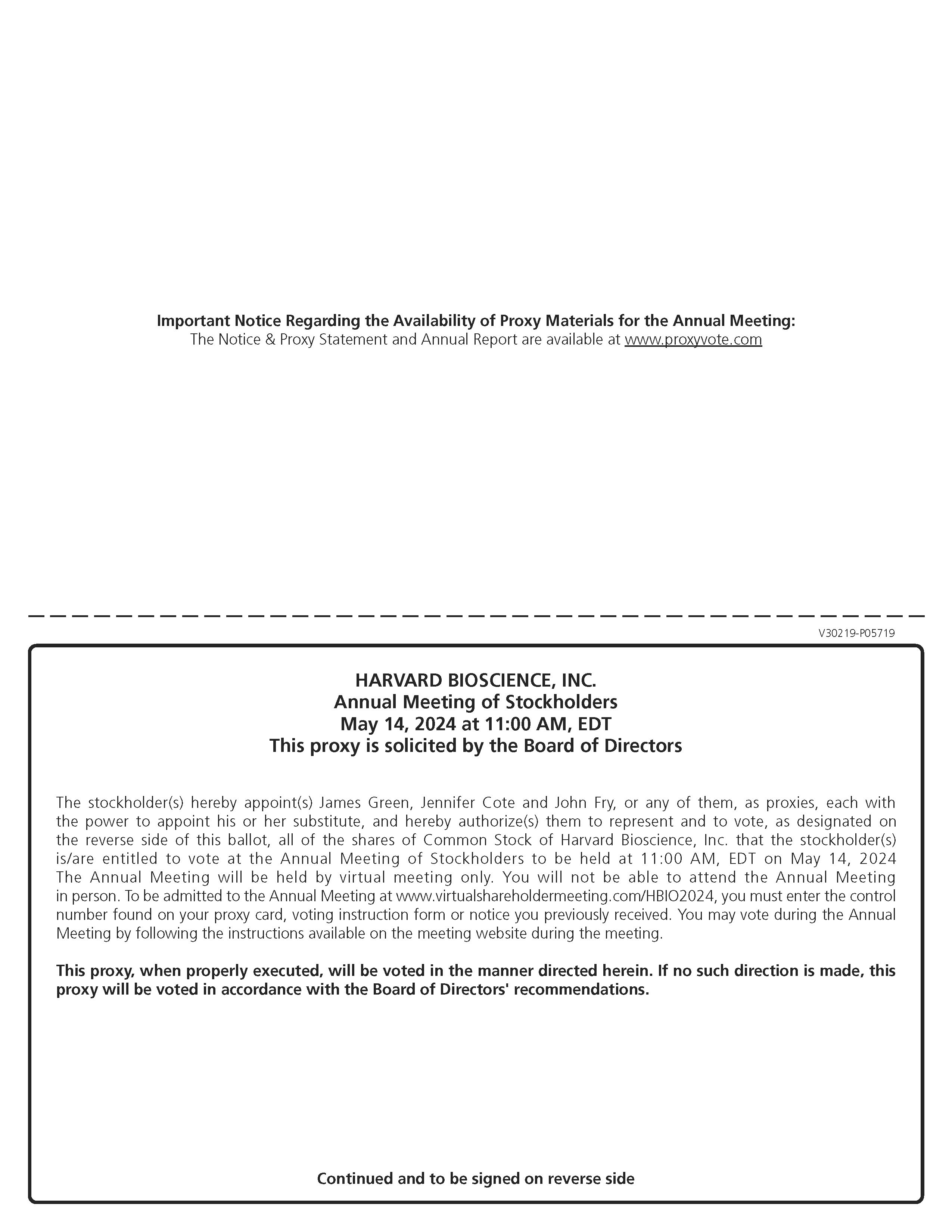 You are cordially invited to attend the 2024 Annual Meeting of Stockholders of Harvard Bioscience, Inc. (the “Annual Meeting”) to be held on Tuesday, May 14, 2024 at 11:00 a.m. EDT. The Annual Meeting will be held by virtual meeting only. You will not be able to attend the Annual Meeting in person. To be admitted to the Annual Meeting at www.virtualshareholdermeeting.com/HBIO2024, you must enter the control number found on your proxy card, voting instruction form or notice you previously received. You may vote during the Annual Meeting by following the instructions available on the meeting website during the meeting. At the meeting, we will be voting on the matters described in the accompanying proxy statement.