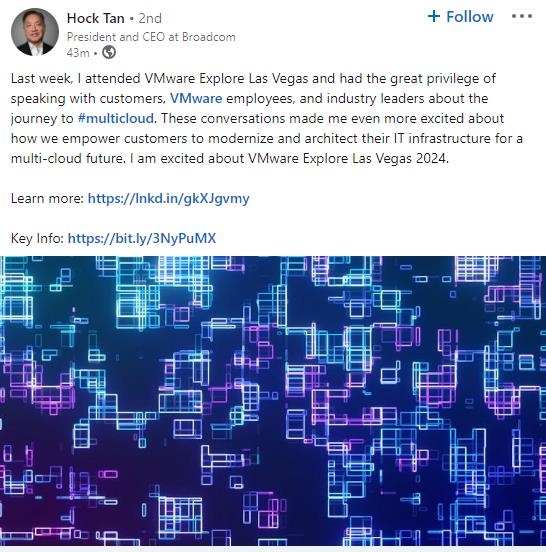 On August 28, 2023, Hock Tan, President and CEO of Broadcom Inc., published the following post on LinkedIn:
