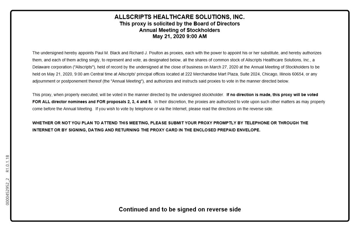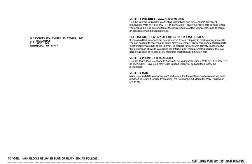 *** Exercise Your Right to Vote ***Important Notice Regarding the Availability of Proxy Materials for theStockholder Meeting to Be Held on May23,2019ALLSCRIPTS HEALTHCARE SOLUTIONS, INC ALLSCRIPTS HEALTHCARE SOLUTIONS, INC. C/O BROADRIDGE P.O. BOX 1342 BRENTWOOD, NY 11717 0000414544_1 R1.0.1.18 Meeting Information Meeting Type: Annual Meeting For holders as of: March 29, 2019 Date:May 23, 2019 Time: 9:00 AM CDT Location: Allscripts' Principal Offices 222 Merchandise Mart Plaza Suite 2024 Chicago, Illinois 60654 You are receiving this communication because you hold shares in the above named company. This is not a ballot. You cannot use this notice to vote these shares. This communication presents only an overview of the more complete proxy materials that are available to you on the Internet. You may view the proxy materials online at www.proxyvote.com or easily request a paper copy (see reverse side). We encourage you to access and review all of the important information contained in the proxy materials before voting. See the reverse side of this notice to obtain proxy materials and voting instructions.