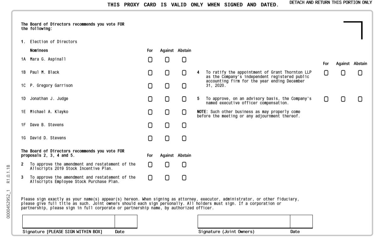 Voting items The Board of Directors recommends you vote FOR the following: 1. Election of Directors Nominees 1A Mara G. Aspinall 1B Paul M. Black 1C P. Gregory Garrison 1D Jonathan J. Judge 1E Michael A. Klayko 1F Yancey L. Spruill 1G Dave B. Stevens 1H David D. Stevens The Board of Directors recommends you vote FOR proposals 2, 3 and 4. 2 To approve the Allscripts Healthcare Solutions, Inc. 2019 Stock Incentive Plan. 3 To ratify the appointment of Grant Thornton LLP as the Company's independent registered public accounting firm for the year ending December 31, 2019. 4 To approve, on an advisory basis, the Company's named executive officer compensation. NOTE: Such other business as may properly come before the meeting or any adjournment thereof. 0000414544_3 R1.0.1.18
