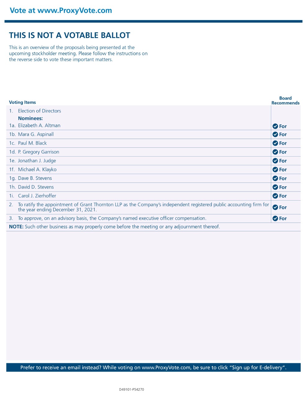 Vote at www.ProxyVote.com THIS IS NOT A VOTABLE BALLOT This is an overview of the proposals being presented at the upcoming stockholder meeting. Please follow the instructions on the reverse side to vote these important matters. Voting Items Board Recommends 1. Election of Directors Nominees: 1a. Elizabeth A. Altman For 1b. Mara G. Aspinall For 1c. Paul M. Black For 1d. P. Gregory Garrison For 1e. Jonathan J. Judge For 1f. Michael A. Klayko For 1g. Dave B. Stevens For 1h. David D. Stevens For 1i. Carol J. Zierhoffer For 2. To ratify the appointment of Grant Thornton LLP as the Company’s independent registered public accounting firm for the year ending December 31, 2021. For 3. To approve, on an advisory basis, the Company’s named executive officer compensation. For NOTE: Such other business as may properly come before the meeting or any adjournment thereof. Prefer to receive an email instead? While voting on www.ProxyVote.com, be sure to click “Sign up for E-delivery”. D49101-P54270