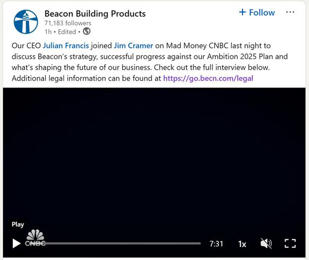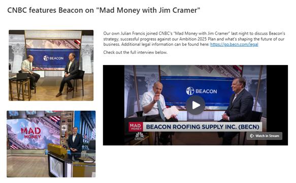 On January 28, 2025, Beacon Roofing Supply, Inc. (the “Company”) posted the following communication on the Company’s intranet site: