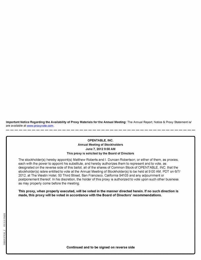 0000137130_2 R1.0.0.11699 Important Notice Regarding the Availability of Proxy Materials for the Annual Meeting: The Annual Report, Notice & Proxy Statement is/ are available at www.proxyvote.com . OPENTABLE, INC. Annual Meeting of Stockholders June 7, 2012 9:00 AM This proxy is solicited by the Board of Directors The stockholder(s) hereby appoint(s) Matthew Roberts and I. Duncan Robertson, or either of them, as proxies, each with the power to appoint his substitute, and hereby authorizes them to represent and to vote, as designated on the reverse side of this ballot, all of the shares of Common Stock of OPENTABLE, INC. that the stockholder(s) is/are entitled to vote at the Annual Meeting of Stockholder(s) to be held at 9:00 AM, PDT on 6/7/ 2012, at The Westin Hotel, 50 Third Street, San Francisco, California 94103 and any adjournment or postponement thereof. In his discretion, the holder of this proxy is authorized to vote upon such other business as may properly come before the meeting. This proxy, when properly executed, will be voted in the manner directed herein. If no such direction is made, this proxy will be voted in accordance with the Board of Directors' recommendations. Continued and to be signed on reverse side |