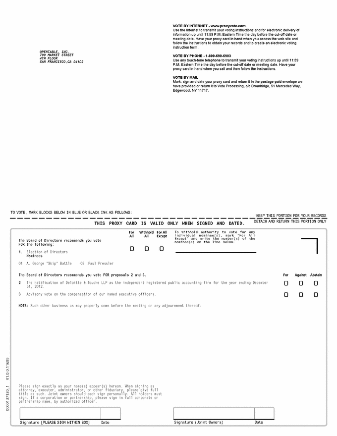 THIS PROXY CARD IS VALID ONLY WHEN SIGNED AND DATED. KEEP THIS PORTION FOR YOUR RECORDS DETACH AND RETURN THIS PORTION ONLY TO VOTE, MARK BLOCKS BELOW IN BLUE OR BLACK INK AS FOLLOWS: Signature (Joint Owners) Signature [PLEASE SIGN WITHIN BOX] Date Date To withhold authority to vote for any individual nominee(s), mark “For All Except” and write the number(s) of the nominee(s) on the line below. 0000137130_1 R1.0.0.11699 For Withhold For All All All Except The Board of Directors recommends you vote FOR the following: 1. Election of Directors Nominees 01 A. George "Skip" Battle 02 Paul Pressler OPENTABLE, INC. 799 MARKET STREET 4TH FLOOR SAN FRANCISCO,CA 94103 VOTE BY INTERNET - www.proxyvote.com Use the Internet to transmit your voting instructions and for electronic delivery of information up until 11:59 P.M. Eastern Time the day before the cut-off date or meeting date. Have your proxy card in hand when you access the web site and follow the instructions to obtain your records and to create an electronic voting instruction form. VOTE BY PHONE - 1-800-690-6903 Use any touch-tone telephone to transmit your voting instructions up until 11:59 P.M. Eastern Time the day before the cut-off date or meeting date. Have your proxy card in hand when you call and then follow the instructions. VOTE BY MAIL Mark, sign and date your proxy card and return it in the postage-paid envelope we have provided or return it to Vote Processing, c/o Broadridge, 51 Mercedes Way, Edgewood, NY 11717. The Board of Directors recommends you vote FOR proposals 2 and 3. For Against Abstain 2 The ratification of Deloitte & Touche LLP as the independent registered public accounting firm for the year ending December 31, 2012. 3 Advisory vote on the compensation of our named executive officers. NOTE: Such other business as may properly come before the meeting or any adjournment thereof. Please sign exactly as your name(s) appear(s) hereon. When signing as attorney, executor, administrator, or other fiduciary, please give full title as such. Joint owners should each sign personally. All holders must sign. If a corporation or partnership, please sign in full corporate or partnership name, by authorized officer. |