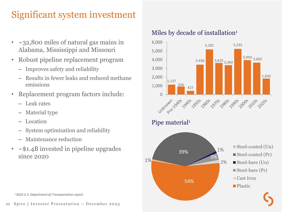 Capital plan overview 10-year capex forecast $11.2B (Millions) 5-year 10-year FY26E FY27E FY28E FY29E FY30E FY26 - FY30E FY26 - FY35E Missouri $535 $555 $595 $630 $675 $2,990 $7,075 Alabama, Gulf and MS 170 175 180 185 190 900 1,950 1 Tennessee 90 175 185 200 215 865 2,175 2 Midstream 14 1 1 1 1 18 23 $809 $906 $961 $1,016 $1,079 $4,773 $11,223 Total 10-year capex breakdown (FY26-FY35E) Other 11% • Investing in infrastructure while balancing customer affordability Customer 19% Safety and • Expect to recover ~96% of investments via expansion $11.2B reliability 70% forward test year ratemaking, true-up or capital recovery mechanisms 1 2 Includes Tennessee capex beginning 2H FY26. Excludes storage capex after FY26. 9 S p i r e | I n v e s t o r P r e s e n t a t i o n – D e c e m b e r 2 0 2 5