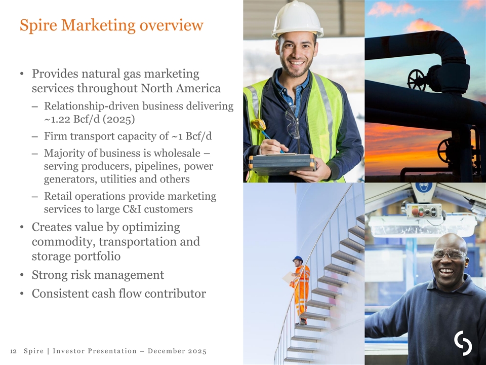 Gas Utility update • Safely and reliably deliver natural gas • Robust investment in infrastructure modernization driving benefits for customers, shareholders and communities • Focus on cost management and customer affordability • Regulatory and legislative matters – In Sept. 2025, MoPSC approved stipulation and agreement in Spire Missouri rate case • $210M annual revenue increase • Rates effective Oct. 24, 2025 – In Nov. 2025, Spire Missouri filed for $30.3M in ISRS revenues – Spire Alabama and Spire Gulf rates approved and effective Dec. 2025 – SB 4 signed into law in Missouri enabling future test year ratemaking beginning July 2026 11 S p i r e | I n v e s t o r P r e s e n t a t i o n – D e c e m b e r 2 0 2 5