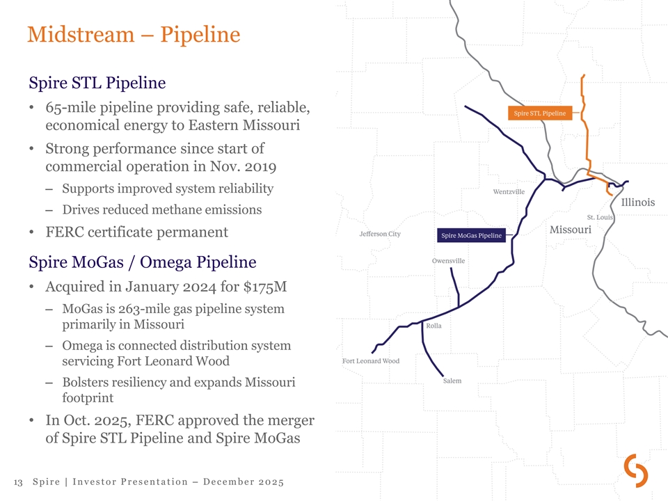 Spire Marketing overview • Provides natural gas marketing services throughout North America – Relationship-driven business delivering ~1.22 Bcf/d (2025) – Firm transport capacity of ~1 Bcf/d – Majority of business is wholesale – serving producers, pipelines, power generators, utilities and others – Retail operations provide marketing services to large C&I customers • Creates value by optimizing commodity, transportation and storage portfolio • Strong risk management • Consistent cash flow contributor 12 S p i r e | I n v e s t o r P r e s e n t a t i o n – D e c e m b e r 2 0 2 5