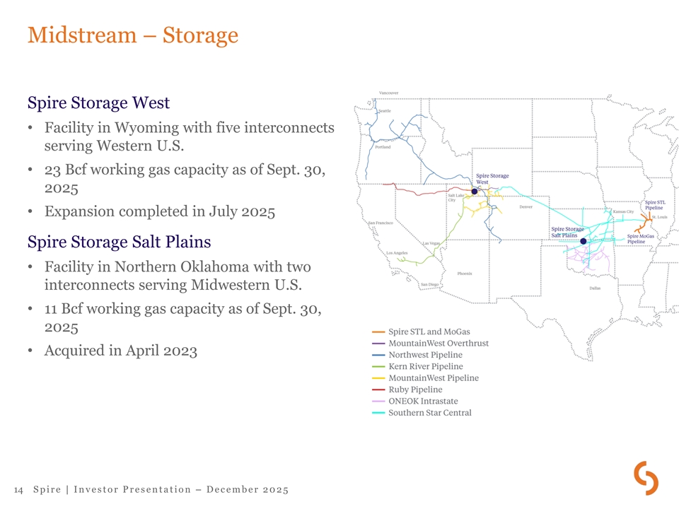 SLL Midstream – Pipeline Spire STL Pipeline • 65-mile pipeline providing safe, reliable, economical energy to Eastern Missouri • Strong performance since start of commercial operation in Nov. 2019 – Supports improved system reliability – Drives reduced methane emissions • FERC certificate permanent Spire MoGas / Omega Pipeline • Acquired in January 2024 for $175M – MoGas is 263-mile gas pipeline system primarily in Missouri – Omega is connected distribution system servicing Fort Leonard Wood – Bolsters resiliency and expands Missouri footprint • In Oct. 2025, FERC approved the merger of Spire STL Pipeline and Spire MoGas 13 S p i r e | I n v e s t o r P r e s e n t a t i o n – D e c e m b e r 2 0 2 5