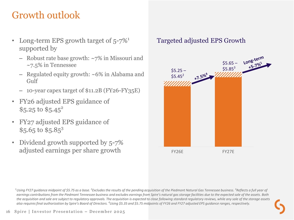 FY25 adjusted earnings (Millions) $2.5 $(7.8) $22.8 $275.5 $10.6 $247.4 FY24 Gas Utility Midstream Gas Marketing Other & elims FY25 1 Overall adjusted earnings higher +$28.1M due to: • Gas Utility earnings (pre-tax) growth reflects: higher MO ISRS revenues (+$33.5M) and AL RSE (+5.0M); partially offset 2 by AL usage net of weather mitigation (-$3.0M), higher run-rate O&M (-$13.1M) and depreciation expense (-$14.0M) • Higher Midstream growth driven by additional storage capacity, contract renewals at higher rates and asset optimization; acquisition of MoGas; partially offset by higher O&M (-$13.1M) and depreciation expense due to scale • Gas Marketing results increased due to the business being well-positioned to create value, partially offset by higher storage and transportation fees • Other reflects lower corporate expense offset by the absence of FY24 (-$6.3M) after-tax benefit of an interest rate hedge and higher interest expense due to higher short-term balances 1 See adjusted earnings reconciliation to GAAP. 2 See Key FY25 variances in Appendix for run-rate O&M reconciliation. 15 S p i r e | I n v e s t o r P r e s e n t a t i o n – D e c e m b e r 2 0 2 5