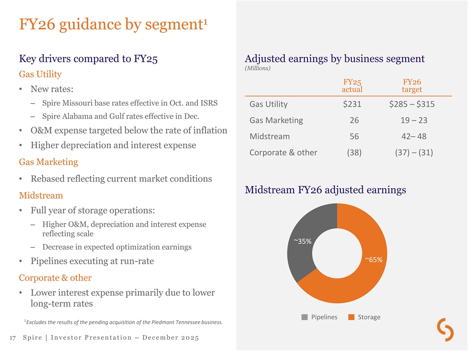 Growth outlook 1 • Long-term EPS growth target of 5-7% Targeted adjusted EPS Growth supported by – Robust rate base growth: ~7% in Missouri and $5.65 – ~7.5% in Tennessee 3 $5.85 $5.25 – – Regulated equity growth: ~6% in Alabama and 2 $5.45 Gulf – 10-year capex target of $11.2B (FY26-FY35E) • FY26 adjusted EPS guidance of 2 $5.25 to $5.45 • FY27 adjusted EPS guidance of 3 $5.65 to $5.85 • Dividend growth supported by 5-7% adjusted earnings per share growth FY26E FY27E 1 2 3 Using FY27 guidance midpoint of $5.75 as a base. Excludes the results of the pending acquisition of the Piedmont Natural Gas Tennessee business. Reflects a full year of earnings contributions from the Piedmont Tennessee business and excludes earnings from Spire’s natural gas storage facilities due to the expected sale of the assets. Both the acquisition and sale are subject to regulatory approvals. The acquisition is expected to close following standard regulatory reviews, while any sale of the storage assets 4 also requires final authorization by Spire’s Board of Directors. Using $5.35 and $5.75 midpoints of FY26 and FY27 adjusted EPS guidance ranges, respectively. 16 S p i r e | I n v e s t o r P r e s e n t a t i o n – D e c e m b e r 2 0 2 5