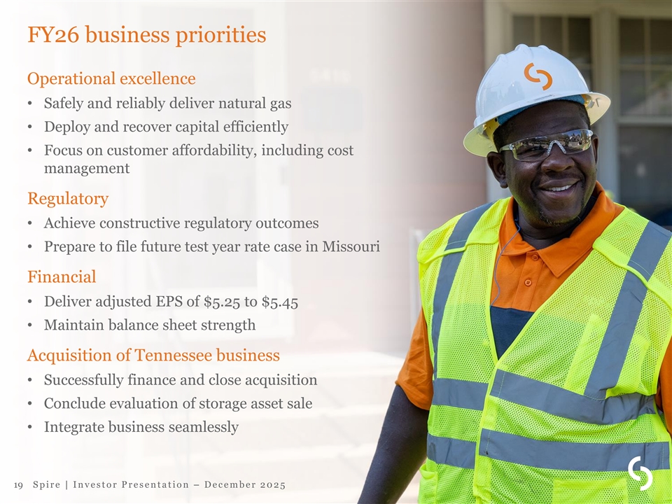 Base business financing plan Excludes Tennessee acquisition Debt maturities and expected issuances • Equity (Millions) – FY26E to FY28E: $0-$50M per year • Debt – Refinancing of maturities and funding of capital plan $700 $550 – $200M Spire Missouri First Mortgage $480 $100 1 Bonds issued Oct. 23 $45 $0 • Proceeds used for general corporate FY26E FY27E FY28E purposes Maturities Expected issuances • FFO/Debt target of 15-16% 1 Includes $150M 4.60% FMB due Sept. 15, 2030, and $50M 4.65% FMB due Jan. 15, 2031. 18 S p i r e | I n v e s t o r P r e s e n t a t i o n – D e c e m b e r 2 0 2 5