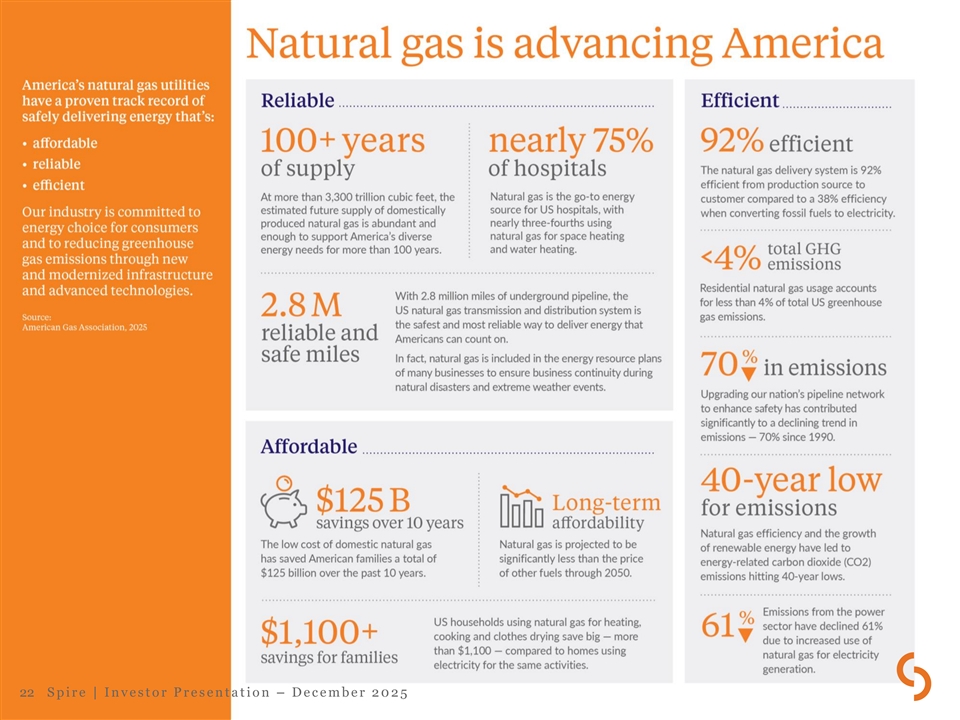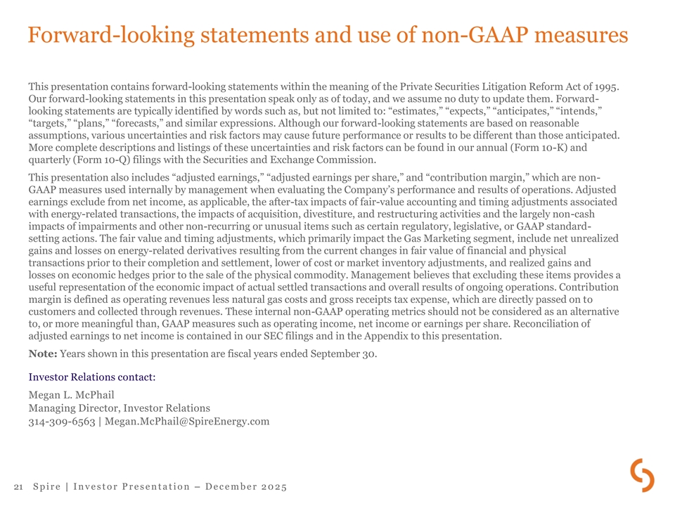Forward-looking statements and use of non-GAAP measures This presentation contains forward-looking statements within the meaning of the Private Securities Litigation Reform Act of 1995. Our forward-looking statements in this presentation speak only as of today, and we assume no duty to update them. Forward- looking statements are typically identified by words such as, but not limited to: “estimates,” “expects,” “anticipates,” “intends,” “targets,” “plans,” “forecasts,” and similar expressions. Although our forward-looking statements are based on reasonable assumptions, various uncertainties and risk factors may cause future performance or results to be different than those anticipated. More complete descriptions and listings of these uncertainties and risk factors can be found in our annual (Form 10-K) and quarterly (Form 10-Q) filings with the Securities and Exchange Commission. This presentation also includes “adjusted earnings,” “adjusted earnings per share,” and “contribution margin,” which are non- GAAP measures used internally by management when evaluating the Company’s performance and results of operations. Adjusted earnings exclude from net income, as applicable, the after-tax impacts of fair-value accounting and timing adjustments associated with energy-related transactions, the impacts of acquisition, divestiture, and restructuring activities and the largely non-cash impacts of impairments and other non-recurring or unusual items such as certain regulatory, legislative, or GAAP standard- setting actions. The fair value and timing adjustments, which primarily impact the Gas Marketing segment, include net unrealized gains and losses on energy-related derivatives resulting from the current changes in fair value of financial and physical transactions prior to their completion and settlement, lower of cost or market inventory adjustments, and realized gains and losses on economic hedges prior to the sale of the physical commodity. Management believes that excluding these items provides a useful representation of the economic impact of actual settled transactions and overall results of ongoing operations. Contribution margin is defined as operating revenues less natural gas costs and gross receipts tax expense, which are directly passed on to customers and collected through revenues. These internal non-GAAP operating metrics should not be considered as an alternative to, or more meaningful than, GAAP measures such as operating income, net income or earnings per share. Reconciliation of adjusted earnings to net income is contained in our SEC filings and in the Appendix to this presentation. Note: Years shown in this presentation are fiscal years ended September 30. Investor Relations contact: Megan L. McPhail Managing Director, Investor Relations 314-309-6563 | Megan.McPhail@SpireEnergy.com 21 S p i r e | I n v e s t o r P r e s e n t a t i o n – D e c e m b e r 2 0 2 5
