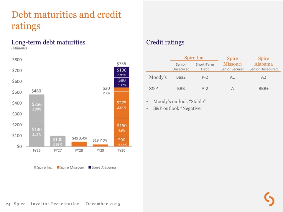 Debt maturities and credit ratings Long-term debt maturities Credit ratings (Millions) Spire Inc. Spire Spire $800 $735 Senior Short-Term Missouri Alabama Unsecured Debt Senior Secured Senior Unsecured $100 $700 2.88% Moody’s Baa2 P-2 A1 A2 $90 $600 5.32% $30 BBB A-2 A BBB+ S&P $480 $500 7.9% • Moody’s outlook “Stable” $275 $400 $350 2.84% • S&P outlook “Negative” 5.30% $300 $200 $150 $130 4.6% 3.13% $100 $45 3.4% $100 $90 $19 7.0% 3.93% 4.88% $0 FY26 FY27 FY28 FY29 FY30 Spire Inc. Spire Missouri Spire Alabama 24 S p i r e | I n v e s t o r P r e s e n t a t i o n – D e c e m b e r 2 0 2 5