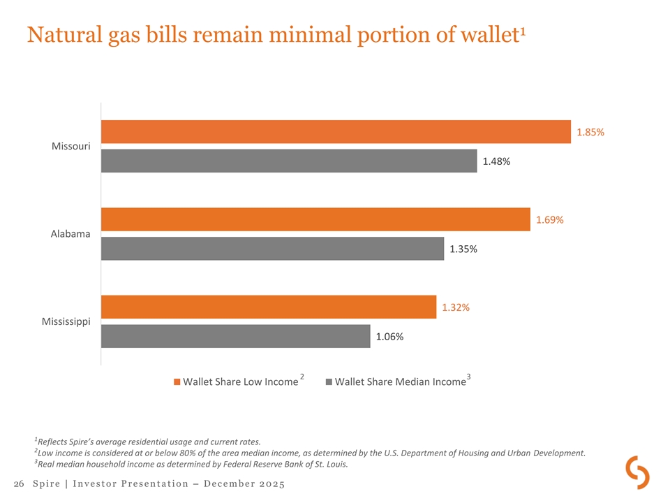 Natural gas as the affordable choice Electricity is 2x to 3x more expensive than natural gas in Spire’s states kWh equivalent 15.82¢ 13.80¢ 13.17¢ 5.92¢ 5.38¢ 4.55¢ Missouri Alabama Mississippi 1 2 Electricity Natural gas 1 US Energy Information Agency residential customer electric rates for the twelve-month average ending August 2025. 2 Represents Spire’s kWh equivalent current average residential customer rate. 25 S p i r e | I n v e s t o r P r e s e n t a t i o n – D e c e m b e r 2 0 2 5