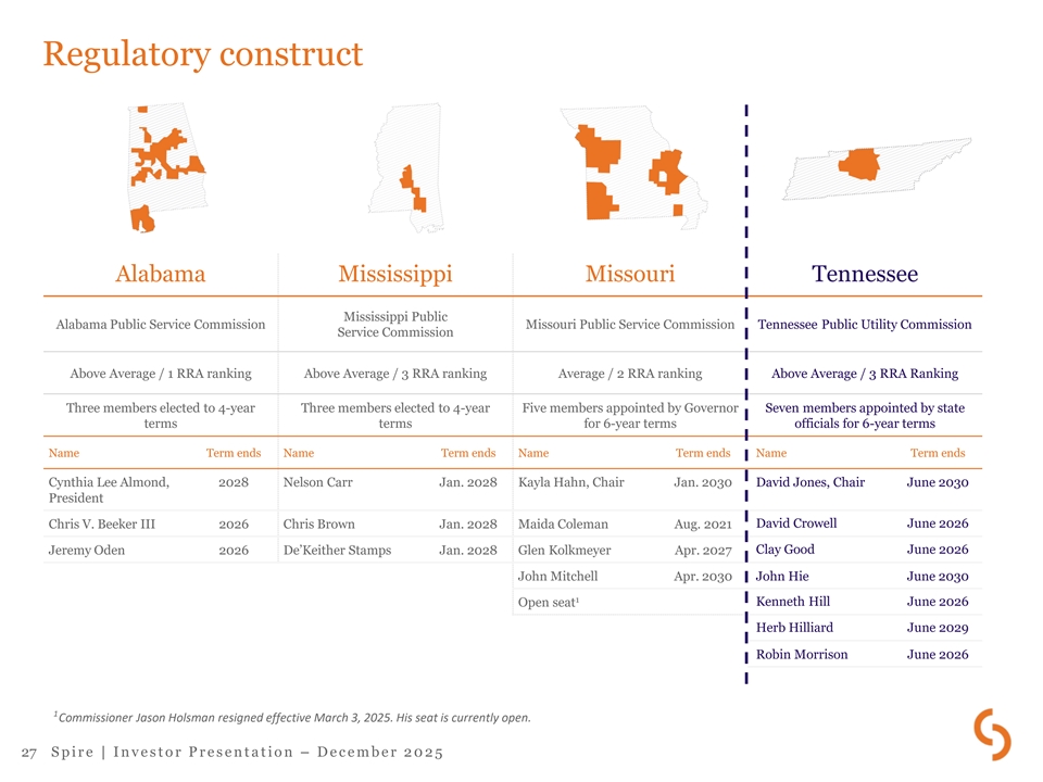Regulatory construct Alabama Mississippi Missouri Tennessee Mississippi Public Alabama Public Service Commission Missouri Public Service Commission Tennessee Public Utility Commission Service Commission Above Average / 1 RRA ranking Above Average / 3 RRA ranking Average / 2 RRA ranking Above Average / 3 RRA Ranking Three members elected to 4-year Three members elected to 4-year Five members appointed by Governor Seven members appointed by state terms terms for 6-year terms officials for 6-year terms Name Term ends Name Term ends Name Term ends Name Term ends Cynthia Lee Almond, 2028 Nelson Carr Jan. 2028 Kayla Hahn, Chair Jan. 2030 David Jones, Chair June 2030 President Chris V. Beeker III 2026 Chris Brown Jan. 2028 Maida Coleman Aug. 2021 David Crowell June 2026 Jeremy Oden 2026 De’Keither Stamps Jan. 2028 Glen Kolkmeyer Apr. 2027 Clay Good June 2026 John Mitchell Apr. 2030 John Hie June 2030 1 Open seat Kenneth Hill June 2026 Herb Hilliard June 2029 Robin Morrison June 2026 1 Commissioner Jason Holsman resigned effective March 3, 2025. His seat is currently open. 27 S p i r e | I n v e s t o r P r e s e n t a t i o n – D e c e m b e r 2 0 2 5