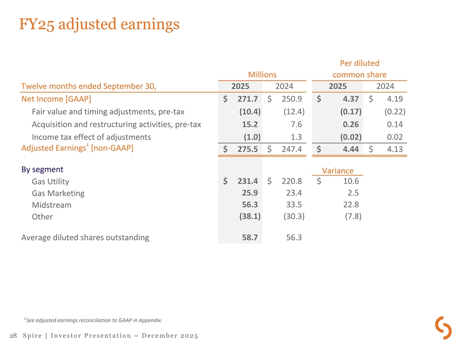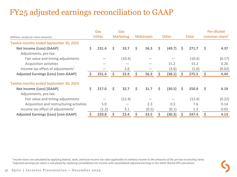 FY25 adjusted earnings reconciliation to GAAP Gas Gas Per diluted 2 Utility Marketing Midstream Other Total common share (Millions, except per share amounts) Twelve months ended September 30, 2025 Net Income (Loss) [GAAP] $ 231.4 $ 33.7 $ 56.3 $ (49.7) $ 271.7 $ 4.37 Adjustments, pre-tax: Fair value and timing adjustments — ( 10.4) — — ( 10.4) ( 0.17) Acquisition activities — — — 15.2 15.2 0.26 1 Income tax effect of adjustments — 2.6 — ( 3.6) ( 1.0) (0.02) Adjusted Earnings (Loss) [non-GAAP] $ 231.4 $ 25.9 $ 56.3 $ (38.1) $ 275.5 $ 4.44 Twelve months ended September 30, 2024 Net Income (Loss) [GAAP] $ 217.0 $ 32.7 $ 31.7 $ (30.5) $ 250.9 $ 4.19 Adjustments, pre-tax: Fair value and timing adjustments — (12.4) — — (12.4) (0.22) Acquisition and restructuring activities 5.0 — 2.3 0.3 7.6 0.14 1 Income tax effect of adjustments ( 1.2) 3.1 (0.5) (0.1) 1.3 0.02 Adjusted Earnings (Loss) [non-GAAP] $ 220.8 $ 23.4 $ 33.5 $ (30.3) $ 247.4 $ 4.13 1 Income taxes are calculated by applying federal, state, and local income tax rates applicable to ordinary income to the amounts of the pre-tax reconciling items. 2 Adjusted earnings per share is calculated by replacing consolidated net income with consolidated adjusted earnings in the GAAP diluted EPS calculation. 31 S p i r e | I n v e s t o r P r e s e n t a t i o n – D e c e m b e r 2 0 2 5