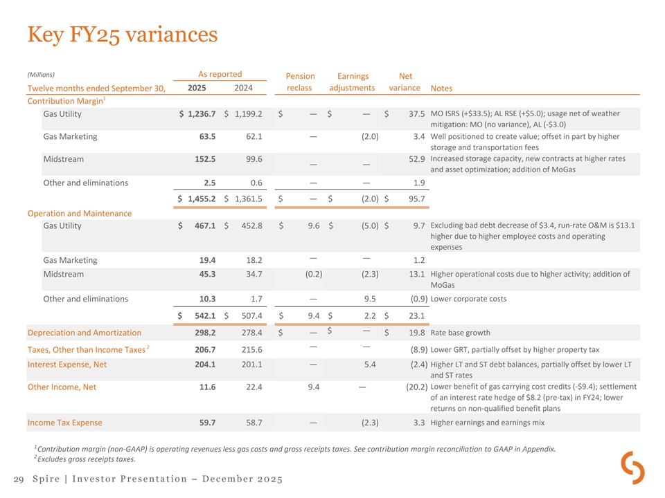 FY25 adjusted earnings Per diluted Millions common share Twelve months ended September 30, 2025 2024 2025 2024 Net Income [GAAP] $ 271.7 $ 250.9 $ 4.37 $ 4.19 Fair value and timing adjustments, pre-tax ( 10.4) (12.4) (0.17) (0.22) Acquisition and restructuring activities, pre-tax 15.2 7.6 0.26 0.14 Income tax effect of adjustments ( 1.0) 1.3 (0.02) 0.02 1 Adjusted Earnings [non-GAAP] $ 275.5 $ 247.4 $ 4.44 $ 4.13 By segment Variance Gas Utility $ 231.4 $ 22 0.8 $ 10 .6 Gas Marketing 25.9 23 .4 2.5 56.3 33.5 22 .8 Midstream ( 38.1) ( 30.3) (7.8) Other Average diluted shares outstanding 58.7 56.3 1 See adjusted earnings reconciliation to GAAP in Appendix. 28 S p i r e | I n v e s t o r P r e s e n t a t i o n – D e c e m b e r 2 0 2 5