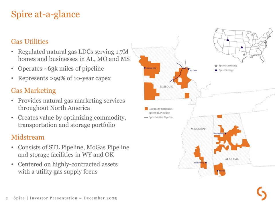 Spire at-a-glance Gas Utilities • Regulated natural gas LDCs serving 1.7M homes and businesses in AL, MO and MS • Operates ~63k miles of pipeline • Represents >99% of 10-year capex Gas Marketing • Provides natural gas marketing services throughout North America • Creates value by optimizing commodity, transportation and storage portfolio Midstream • Consists of STL Pipeline, MoGas Pipeline and storage facilities in WY and OK • Centered on highly-contracted assets with a utility gas supply focus 2 S p i r e | I n v e s t o r P r e s e n t a t i o n – D e c e m b e r 2 0 2 5
