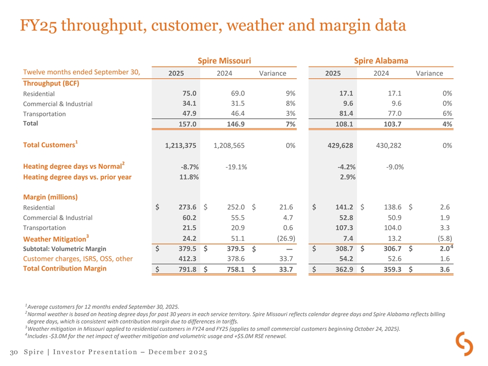 Key FY25 variances (Millions) As reported Pension Earnings Net reclass adjustments variance Twelve months ended September 30, 2025 2024 Notes 1 Contribution Margin MO ISRS (+$33.5); AL RSE (+$5.0); usage net of weather Gas Utility $ 1,236.7 $ 1, 199.2 $ ― $ ― $ 37 .5 mitigation: MO (no variance), AL (-$3.0) Gas Marketing 63.5 62 .1 $ ― (2.0) 3.4 Well positioned to create value; offset in part by higher storage and transportation fees Increased storage capacity, new contracts at higher rates Midstream 152.5 99 .6 52.9 $ ― $ ― and asset optimization; addition of MoGas Other and eliminations 2.5 0.6 $ ― $ ― 1.9 $ 1,455.2 $ 1, 361.5 $ ― $ (2.0) $ 95 .7 Operation and Maintenance Excluding bad debt decrease of $3.4, run-rate O&M is $13.1 Gas Utility $ 467.1 $ 452.8 $ 9.6 $ ( 5.0) $ 9.7 higher due to higher employee costs and operating expenses $ ― $ ― Gas Marketing 19.4 18 .2 1.2 Midstream 45.3 34 .7 (0.2) (2.3) 13.1 Higher operational costs due to higher activity; addition of MoGas Other and eliminations 10.3 1.7 $ ― 9.5 (0.9) Lower corporate costs $ 542.1 $ 507.4 $ 9.4 $ 2.2 $ 23 .1 $ ― Depreciation and Amortization 298.2 278.4 $ ― $ 19 .8 Rate base growth 2 $ ― $ ― Taxes, Other than Income Taxes 206.7 215.6 ( 8.9) Lower GRT, partially offset by higher property tax Interest Expense, Net 204.1 201.1 $ ― 5.4 ( 2.4) Higher LT and ST debt balances, partially offset by lower LT and ST rates Lower benefit of gas carrying cost credits (-$9.4); settlement Other Income, Net 11.6 22 .4 9.4 $ ― (20.2) of an interest rate hedge of $8.2 (pre-tax) in FY24; lower returns on non-qualified benefit plans Higher earnings and earnings mix Income Tax Expense 59.7 58 .7 $ ― (2.3) 3.3 1 Contribution margin (non-GAAP) is operating revenues less gas costs and gross receipts taxes. See contribution margin reconciliation to GAAP in Appendix. 2 Excludes gross receipts taxes. 29 S p i r e | I n v e s t o r P r e s e n t a t i o n – D e c e m b e r 2 0 2 5