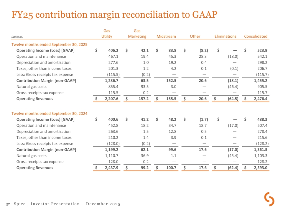 FY25 contribution margin reconciliation to GAAP Gas Gas (Millions) Utility Marketing Midstream Other Eliminations Consolidated Twelve months ended September 30, 2025 Operating Income (Loss) [GAAP] $ 406.2 $ 42.1 $ 83.8 $ (8.2) $ — $ 523.9 Operation and maintenance 467.1 19 .4 45.3 28 .3 (18.0) 542.1 Depreciation and amortization 27 7.6 1.0 19.2 0.4 — 298.2 Taxes, other than income taxes 201.3 1.2 4.2 0.1 (0.1) 206.7 Less: Gross receipts tax expense (115.5) (0.2) — — — (115.7) Contribution Margin [non-GAAP] 1,236.7 63.5 152.5 20.6 (18.1) 1,455.2 Natural gas costs 855.4 93 .5 3.0 — (46.4) 905.5 Gross receipts tax expense 11 5.5 0.2 — — — 115.7 Operating Revenues $ 2,207.6 $ 157.2 $ 155.5 $ 20.6 $ (64.5) $ 2,476.4 Twelve months ended September 30, 2024 Operating Income (Loss) [GAAP] $ 400.6 $ 41.2 $ 48.2 $ (1.7) $ — $ 488.3 Operation and maintenance 452.8 18 .2 34.7 18 .7 (17.0) 507.4 Depreciation and amortization 26 3.6 1.5 12 .8 0.5 — 27 8.4 Taxes, other than income taxes 210.2 1.4 3.9 0.1 — 215.6 Less: Gross receipts tax expense ( 128.0) ( 0.2) — — — ( 128.2) Contribution Margin [non-GAAP] 1,199.2 62.1 99.6 17.6 (17.0) 1,361.5 Natural gas costs 1,110.7 36 .9 1.1 — (45.4) 1,103.3 Gross receipts tax expense 12 8.0 0.2 — — — 12 8.2 Operating Revenues $ 2,437.9 $ 99.2 $ 100.7 $ 17.6 $ (62.4) $ 2,593.0 32 S p i r e | I n v e s t o r P r e s e n t a t i o n – D e c e m b e r 2 0 2 5