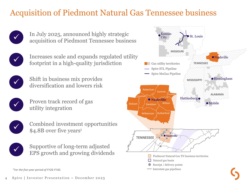 Strategy driving growth, value and sustainability At Spire, we’re focused on growing our businesses organically, investing in infrastructure and driving continuous improvement to deliver value. 90%+ regulated business mix $ 1 Robust 10-year capex plan 11.2B 2 5-7% long-term EPS growth Growing dividend for 23 consecutive years 23 Focus on sustainability 1 Includes Tennessee capex beginning in 2H FY26. Excludes storage capex after FY26. 2 Using FY27 guidance midpoint of $5.75 as a base. 3 S p i r e | I n v e s t o r P r e s e n t a t i o n – D e c e m b e r 2 0 2 5