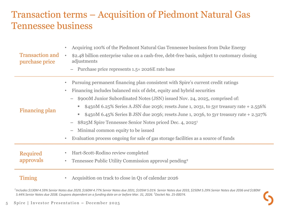 Acquisition of Piedmont Natural Gas Tennessee business Kansas In July 2025, announced highly strategic St. Louis City ✓ acquisition of Piedmont Tennessee business MISSOURI Increases scale and expands regulated utility Nashville ✓ TENNESSEE Gas utility territories footprint in a high-quality jurisdiction Spire STL Pipeline Spire MoGas Pipeline Birmingham Shift in business mix provides MISSISSIPPI ✓ diversification and lowers risk Robertson Sumner Trousdale ALABAMA Cheatham Hattiesburg Nashville Proven track record of gas Wilson Mobile Dickson Davidson ✓ utility integration Rutherford Williamson Combined investment opportunities ✓ 1 $4.8B over five years Nashville TENNESSEE Supportive of long-term adjusted ✓ EPS growth and growing dividends Piedmont Natural Gas TN business territories Natural gas basin Receipt / delivery points 1 Interstate gas pipelines For the five-year period of FY26-FY30. 4 S p i r e | I n v e s t o r P r e s e n t a t i o n – D e c e m b e r 2 0 2 5