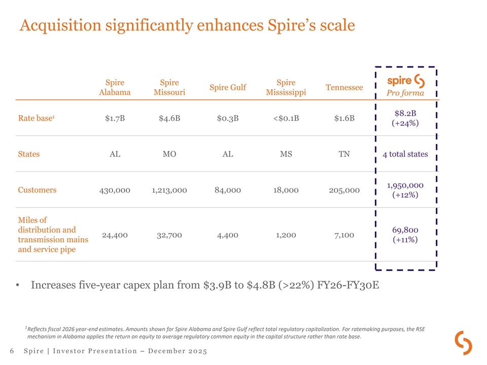 Transaction terms – Acquisition of Piedmont Natural Gas Tennessee business • Acquiring 100% of the Piedmont Natural Gas Tennessee business from Duke Energy Transaction and • $2.48 billion enterprise value on a cash-free, debt-free basis, subject to customary closing adjustments purchase price – Purchase price represents 1.5´ 2026E rate base • Pursuing permanent financing plan consistent with Spire’s current credit ratings • Financing includes balanced mix of debt, equity and hybrid securities – $900M Junior Subordinated Notes (JSN) issued Nov. 24, 2025, comprised of: ▪ $450M 6.25% Series A JSN due 2056; resets June 1, 2031, to 5yr treasury rate + 2.556% Financing plan ▪ $450M 6.45% Series B JSN due 2056; resets June 1, 2036, to 5yr treasury rate + 2.327% 1 – $825M Spire Tennessee Senior Notes priced Dec. 4, 2025 – Minimal common equity to be issued • Evaluation process ongoing for sale of gas storage facilities as a source of funds • Hart-Scott-Rodino review completed Required 2 approvals • Tennessee Public Utility Commission approval pending Timing• Acquisition on track to close in Q1 of calendar 2026 1 Includes $130M 4.59% Senior Notes due 2029, $160M 4.77% Senior Notes due 2031, $105M 5.01% Senior Notes due 2033, $250M 5.29% Senior Notes due 2036 and $180M 2 5.44% Senior Notes due 2038. Coupons dependent on a funding date on or before Mar. 31, 2026. Docket No. 25-00074. 5 S p i r e | I n v e s t o r P r e s e n t a t i o n – D e c e m b e r 2 0 2 5