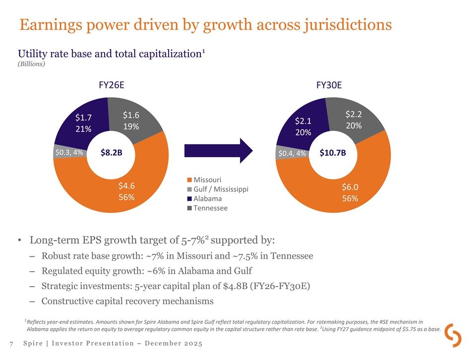 Acquisition significantly enhances Spire’s scale Spire Spire Spire Spire Gulf Tennessee Alabama Missouri Mississippi Pro forma $8.2B 1 Rate base $1.7B $4.6B $0.3B <$0.1B $1.6B (+24%) States AL MO AL MS TN 4 total states 1,950,000 Customers 430,000 1,213,000 84,000 18,000 205,000 (+12%) Miles of distribution and 69,800 24,400 32,700 4,400 1,200 7,100 transmission mains (+11%) and service pipe • Increases five-year capex plan from $3.9B to $4.8B (>22%) FY26-FY30E 1 Reflects fiscal 2026 year-end estimates. Amounts shown for Spire Alabama and Spire Gulf reflect total regulatory capitalization. For ratemaking purposes, the RSE mechanism in Alabama applies the return on equity to average regulatory common equity in the capital structure rather than rate base. 6 S p i r e | I n v e s t o r P r e s e n t a t i o n – D e c e m b e r 2 0 2 5