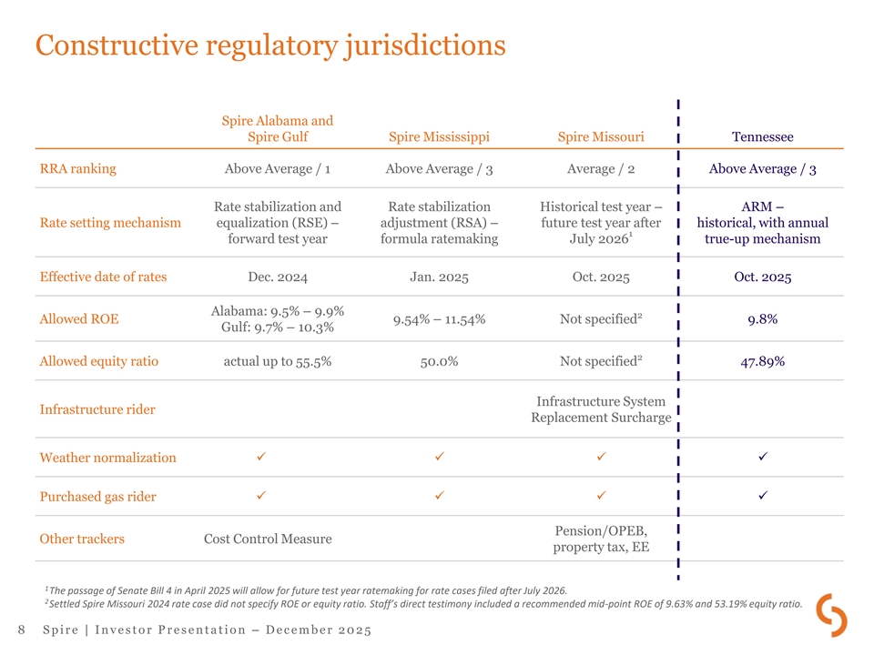Earnings power driven by growth across jurisdictions 1 Utility rate base and total capitalization (Billions) FY26E FY30E $2.2 $1.6 $1.7 $2.1 20% 19% 21% 20% $0.3, 4% $8.2B $0.4, 4% $10.7B Missouri $4.6 $6.0 Gulf / Mississippi 56% Alabama 56% Tennessee 2 • Long-term EPS growth target of 5-7% supported by: – Robust rate base growth: ~7% in Missouri and ~7.5% in Tennessee – Regulated equity growth: ~6% in Alabama and Gulf – Strategic investments: 5-year capital plan of $4.8B (FY26-FY30E) – Constructive capital recovery mechanisms 1 Reflects year-end estimates. Amounts shown for Spire Alabama and Spire Gulf reflect total regulatory capitalization. For ratemaking purposes, the RSE mechanism in 2 Alabama applies the return on equity to average regulatory common equity in the capital structure rather than rate base. Using FY27 guidance midpoint of $5.75 as a base. 7 S p i r e | I n v e s t o r P r e s e n t a t i o n – D e c e m b e r 2 0 2 5