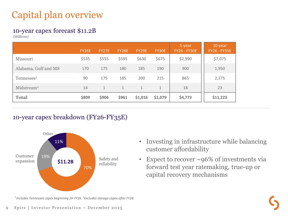 Constructive regulatory jurisdictions Spire Alabama and Spire Gulf Spire Mississippi Spire Missouri Tennessee RRA ranking Above Average / 1 Above Average / 3 Average / 2 Above Average / 3 Rate stabilization and Rate stabilization Historical test year – ARM – Rate setting mechanism equalization (RSE) – adjustment (RSA) – future test year after historical, with annual 1 forward test year formula ratemaking July 2026 true-up mechanism Effective date of rates Dec. 2024 Jan. 2025 Oct. 2025 Oct. 2025 Alabama: 9.5% – 9.9% 2 Allowed ROE 9.54% – 11.54% Not specified 9.8% Gulf: 9.7% – 10.3% 2 Allowed equity ratio actual up to 55.5% 50.0% Not specified 47.89% Infrastructure System Infrastructure rider Replacement Surcharge Weather normalization✓ ✓✓✓ Purchased gas rider✓ ✓✓✓ Pension/OPEB, Other trackers Cost Control Measure property tax, EE 1 The passage of Senate Bill 4 in April 2025 will allow for future test year ratemaking for rate cases filed after July 2026. 2 Settled Spire Missouri 2024 rate case did not specify ROE or equity ratio. Staff’s direct testimony included a recommended mid-point ROE of 9.63% and 53.19% equity ratio. 8 S p i r e | I n v e s t o r P r e s e n t a t i o n – D e c e m b e r 2 0 2 5