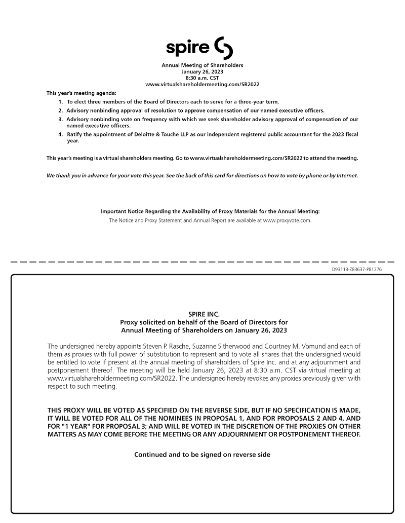 The annual meeting of shareholders of Spire Inc. (“Spire” or the “Company”) will be held on Thursday, January 26, 2023, at 8:30 a.m. CST, online at www.virtualshareholdermeeting.com/SR2022, for the following purposes: