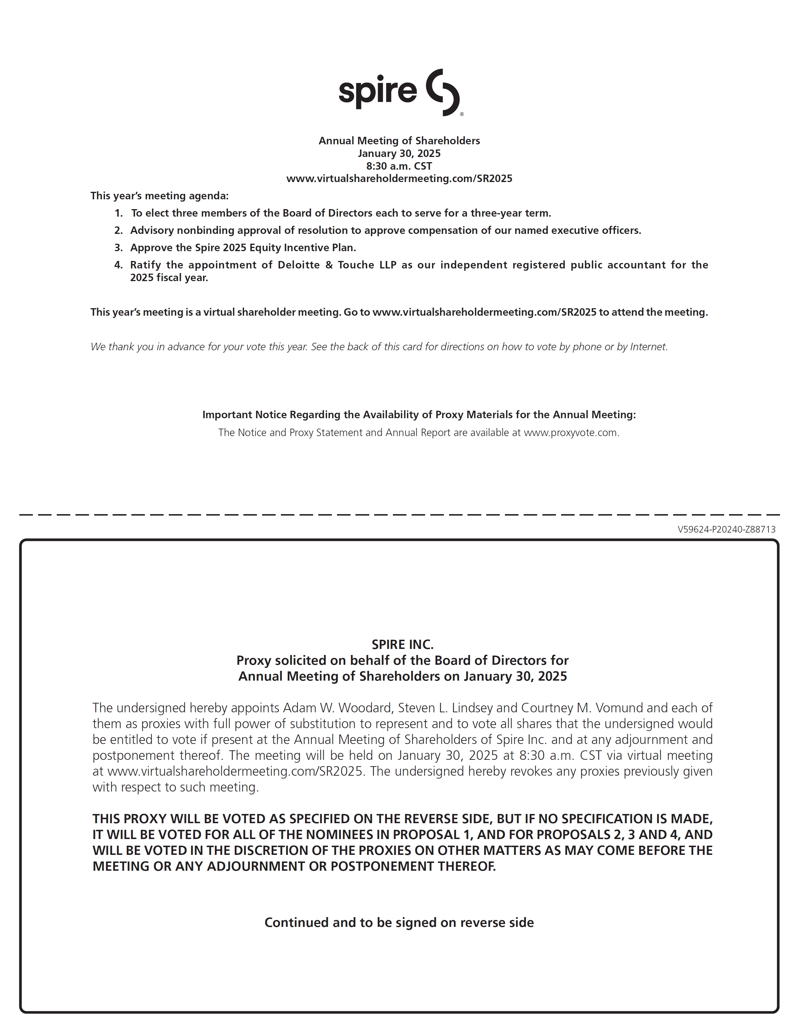 We are pleased to invite you to attend Spire’s 2025 Annual Shareholder Meeting, which is scheduled for Thursday, January 30, 2025, at 8:30 a.m., Central Standard Time. This year’s meeting will be held virtually and the accompanying proxy information outlines how to participate in the meeting as well as the matters that will be voted on at the meeting.