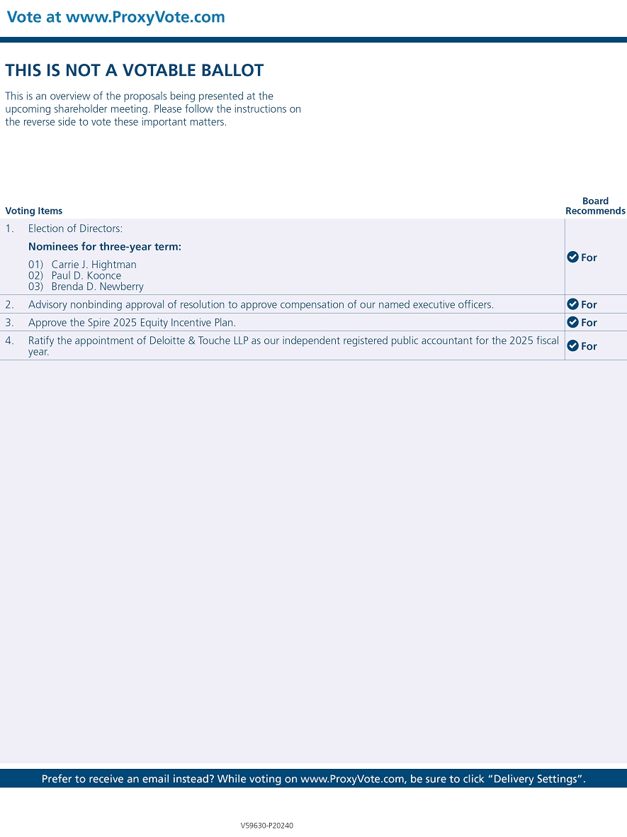 Vote at www.ProxyVote.com THIS IS NOT A VOTABLE BALLOT This is an overview of the proposals being presented at the upcoming shareholder meeting. Please follow the instructions on the reverse side to vote these important matters. Board Voting Items Recommends 1. Election of Directors: Nominees for three-year term: 01) Carrie J. Hightman For 02) Paul D. Koonce 03) Brenda D. Newberry 2. Advisory nonbinding approval of resolution to approve compensation of our named executive officers. For 3. Approve the Spire 2025 Equity Incentive Plan. For 4. Ratify the appointment of Deloitte & Touche LLP as our independent registered public accountant for the 2025 fiscal For year. Prefer to receive an email instead? While voting on www.ProxyVote.com, be sure to click “Delivery Settings”. V59630-P20240