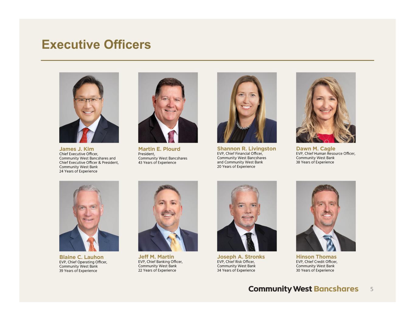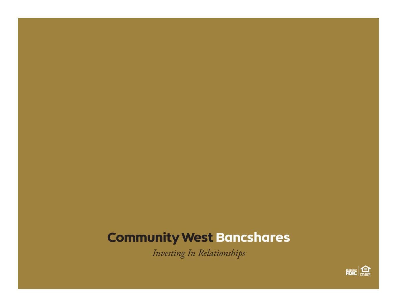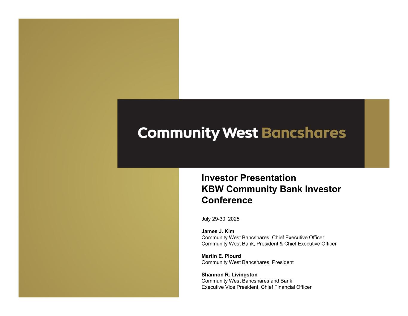 Investor Presentation KBW Community Bank Investor Conference July 29-30, 2025 James J. Kim Community West Bancshares, Chief Executive Officer Community West Bank, President & Chief Executive Officer Martin E. Plourd Community West Bancshares, President Shannon R. Livingston Community West Bancshares and Bank Executive Vice President, Chief Financial Officer