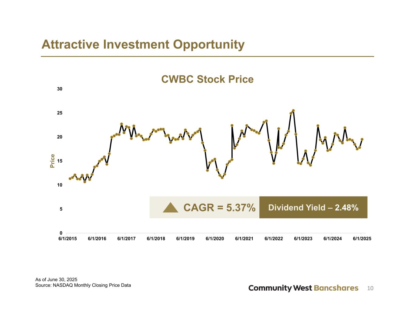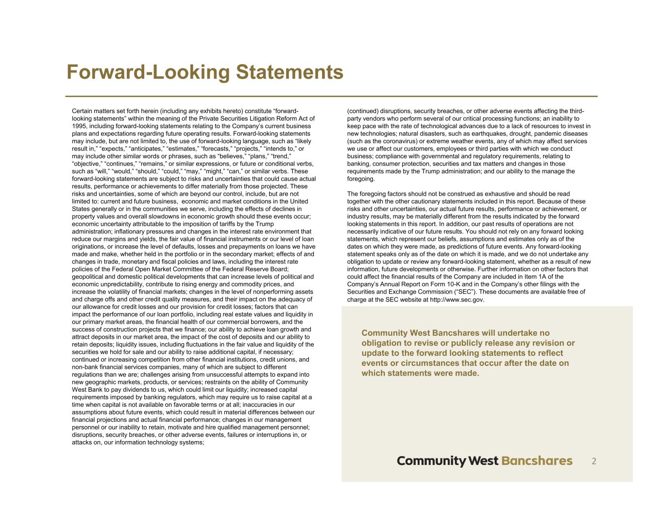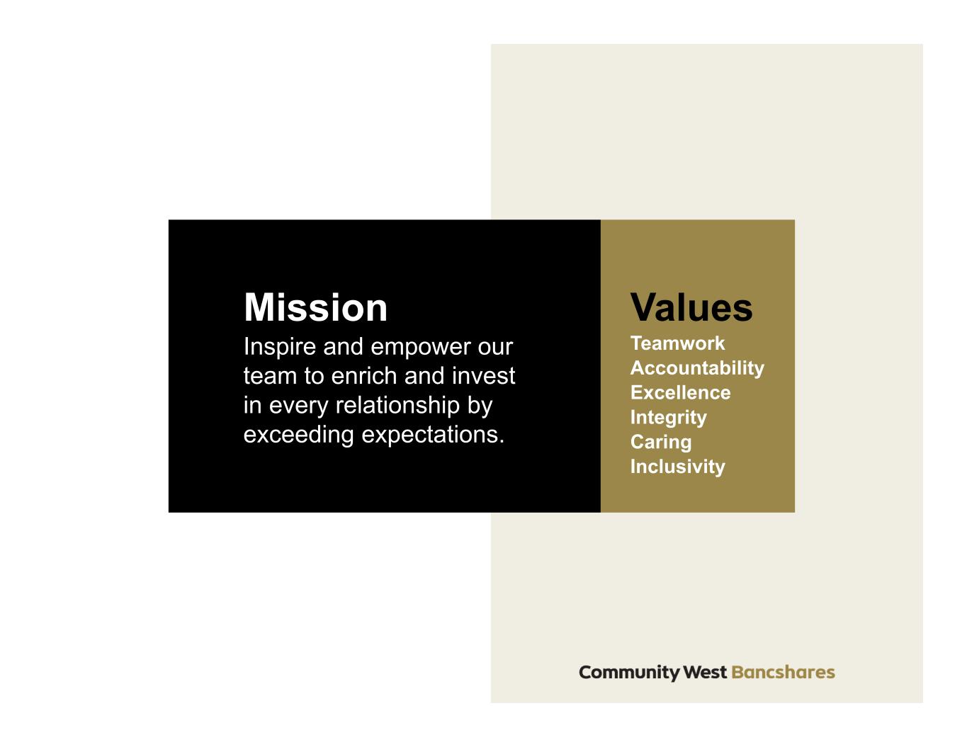 Investor Presentation KBW Community Bank Investor Conference July 29-30, 2025 James J. Kim Community West Bancshares, Chief Executive Officer Community West Bank, President & Chief Executive Officer Martin E. Plourd Community West Bancshares, President Shannon R. Livingston Community West Bancshares and Bank Executive Vice President, Chief Financial Officer