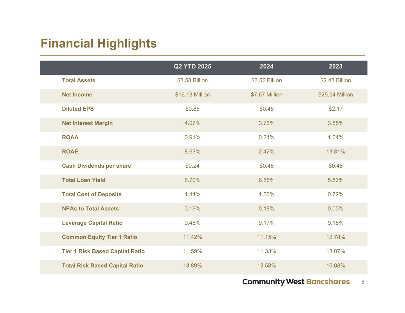 7 NASDAQ Symbol CWBC Market Capitalization $373.2 Million Institutional Ownership 49% Insider Ownership 12% Total Assets $3.6 Billion Headquarters Fresno, CA # of Banking Centers 26 Year Established 1980 Strategic Footprint Central California As of June 30, 2025 Overview