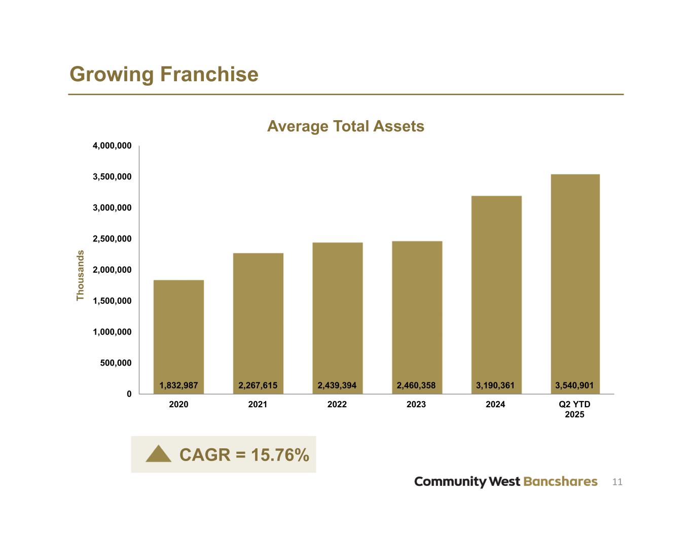 CAGR = 5.37% 10 As of June 30, 2025 Source: NASDAQ Monthly Closing Price Data Attractive Investment Opportunity Dividend Yield – 2.48% 0 5 10 15 20 25 30 6/1/2015 6/1/2016 6/1/2017 6/1/2018 6/1/2019 6/1/2020 6/1/2021 6/1/2022 6/1/2023 6/1/2024 6/1/2025 Pr ic e CWBC Stock Price