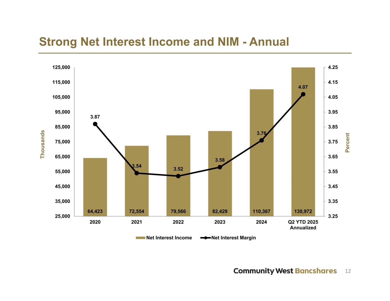 11 Growing Franchise CAGR = 15.76% 1,832,987 2,267,615 2,439,394 2,460,358 3,190,361 3,540,901 0 500,000 1,000,000 1,500,000 2,000,000 2,500,000 3,000,000 3,500,000 4,000,000 2020 2021 2022 2023 2024 Q2 YTD 2025 Th ou sa nd s Average Total Assets