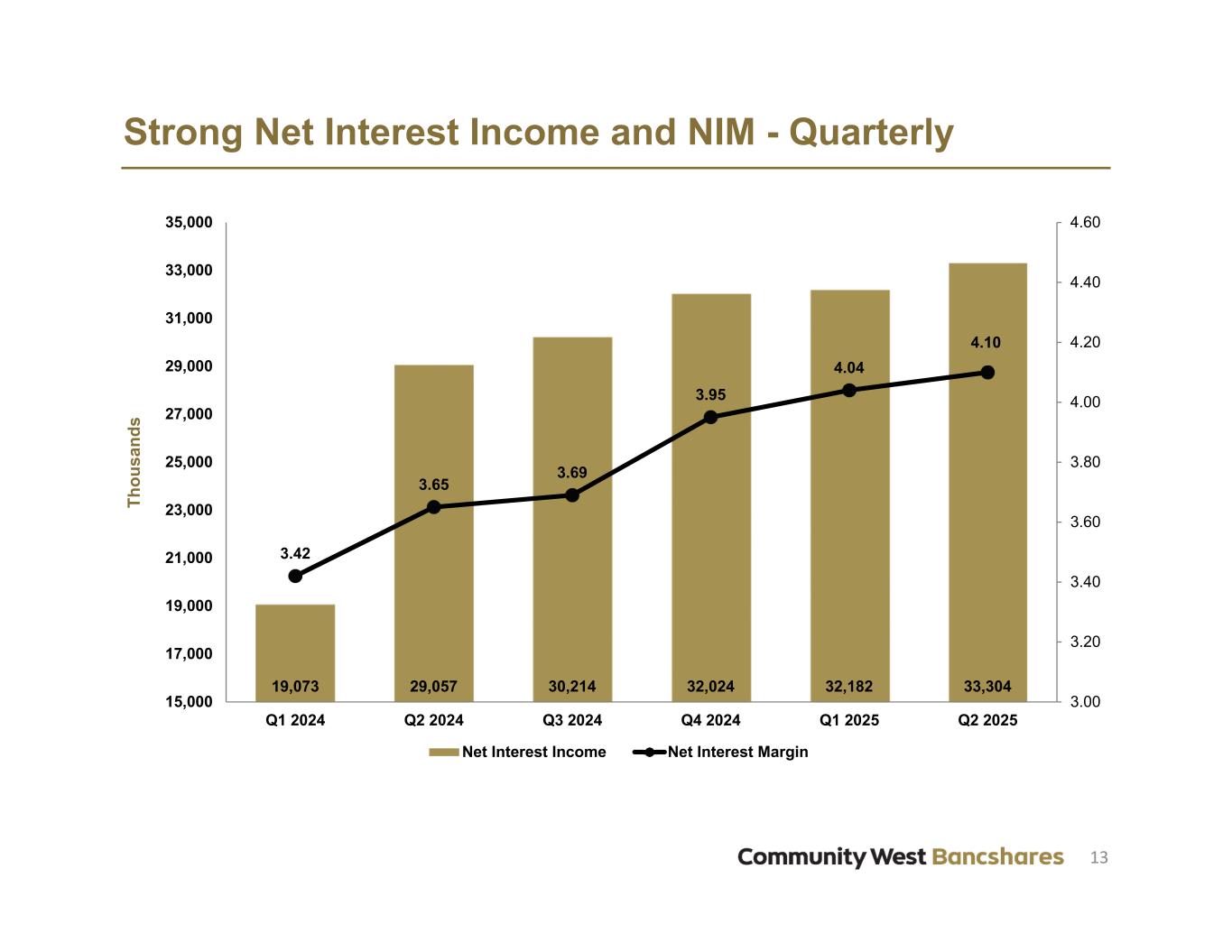 12 Strong Net Interest Income and NIM - Annual 64,423 72,554 79,566 82,429 110,367 130,972 3.87 3.54 3.52 3.58 3.76 4.07 3.25 3.35 3.45 3.55 3.65 3.75 3.85 3.95 4.05 4.15 4.25 25,000 35,000 45,000 55,000 65,000 75,000 85,000 95,000 105,000 115,000 125,000 2020 2021 2022 2023 2024 Q2 YTD 2025 Annualized Pe rc en t Th ou sa nd s Net Interest Income Net Interest Margin