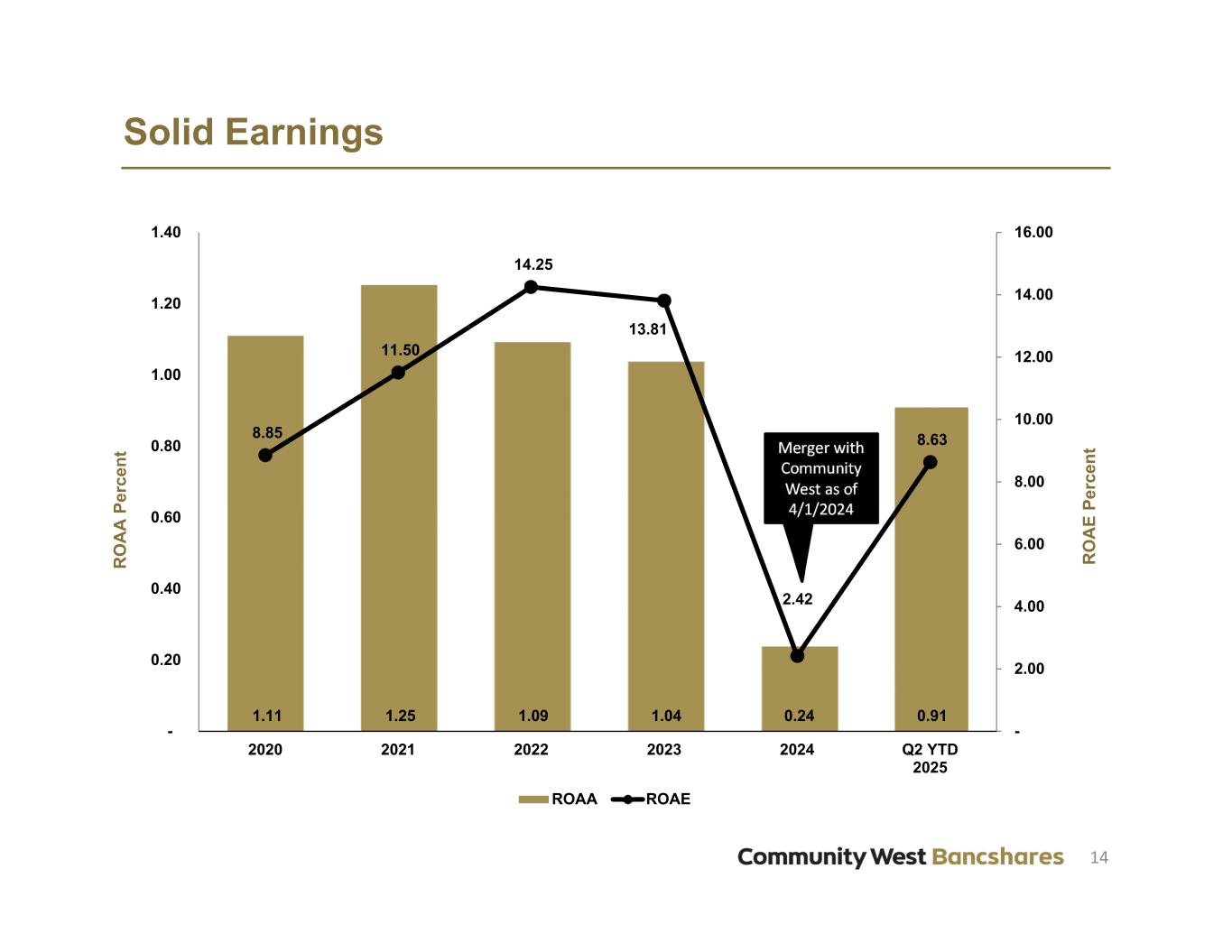 14 Solid Earnings Merger with Community West as of 4/1/2024 1.11 1.25 1.09 1.04 0.24 0.91 8.85 11.50 14.25 13.81 2.42 8.63 - 2.00 4.00 6.00 8.00 10.00 12.00 14.00 16.00 - 0.20 0.40 0.60 0.80 1.00 1.20 1.40 2020 2021 2022 2023 2024 Q2 YTD 2025 R O A E Pe rc en t R O A A P er ce nt ROAA ROAE