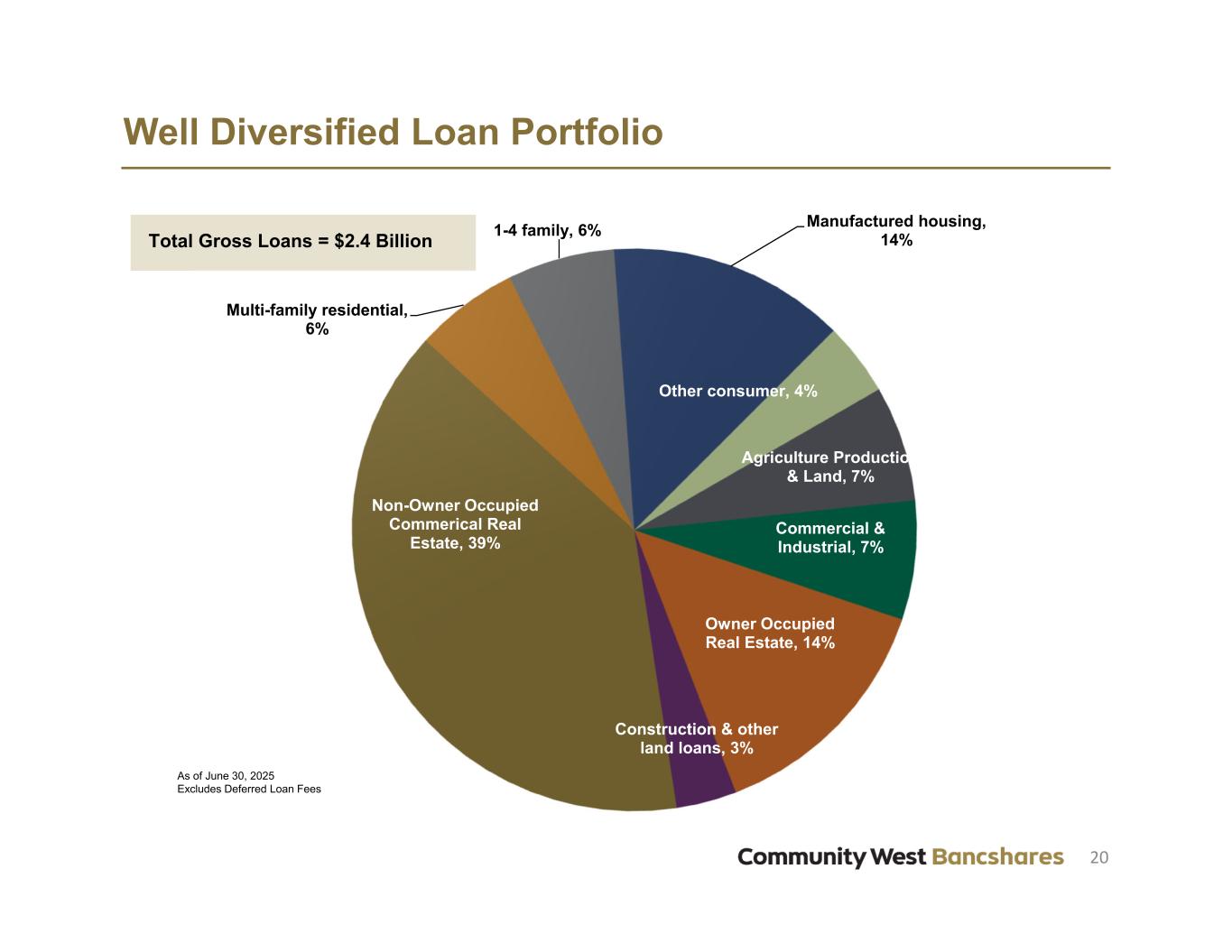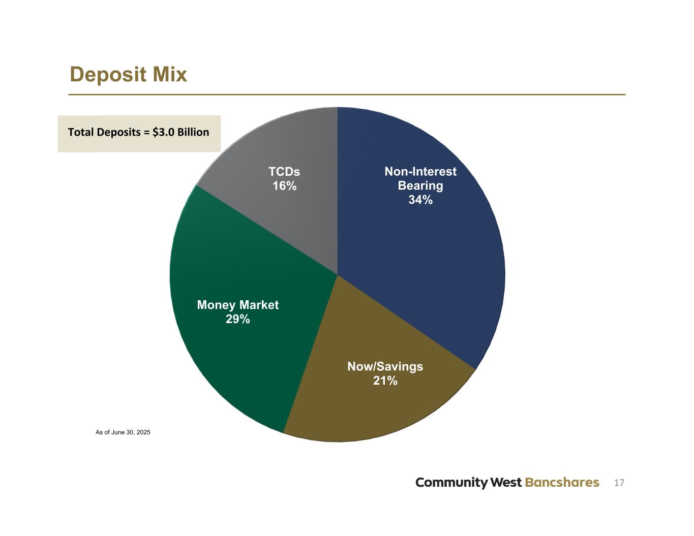 Forward-Looking Statements 2 Certain matters set forth herein (including any exhibits hereto) constitute “forward- looking statements” within the meaning of the Private Securities Litigation Reform Act of 1995, including forward-looking statements relating to the Company’s current business plans and expectations regarding future operating results. Forward-looking statements may include, but are not limited to, the use of forward-looking language, such as “likely result in,” “expects,” “anticipates,” “estimates,” “forecasts,” “projects,” “intends to,” or may include other similar words or phrases, such as “believes,” “plans,” “trend,” “objective,” “continues,” “remains,” or similar expressions, or future or conditional verbs, such as “will,” “would,” “should,” “could,” “may,” “might,” “can,” or similar verbs. These forward-looking statements are subject to risks and uncertainties that could cause actual results, performance or achievements to differ materially from those projected. These risks and uncertainties, some of which are beyond our control, include, but are not limited to: current and future business, economic and market conditions in the United States generally or in the communities we serve, including the effects of declines in property values and overall slowdowns in economic growth should these events occur; economic uncertainty attributable to the imposition of tariffs by the Trump administration; inflationary pressures and changes in the interest rate environment that reduce our margins and yields, the fair value of financial instruments or our level of loan originations, or increase the level of defaults, losses and prepayments on loans we have made and make, whether held in the portfolio or in the secondary market; effects of and changes in trade, monetary and fiscal policies and laws, including the interest rate policies of the Federal Open Market Committee of the Federal Reserve Board; geopolitical and domestic political developments that can increase levels of political and economic unpredictability, contribute to rising energy and commodity prices, and increase the volatility of financial markets; changes in the level of nonperforming assets and charge offs and other credit quality measures, and their impact on the adequacy of our allowance for credit losses and our provision for credit losses; factors that can impact the performance of our loan portfolio, including real estate values and liquidity in our primary market areas, the financial health of our commercial borrowers, and the success of construction projects that we finance; our ability to achieve loan growth and attract deposits in our market area, the impact of the cost of deposits and our ability to retain deposits; liquidity issues, including fluctuations in the fair value and liquidity of the securities we hold for sale and our ability to raise additional capital, if necessary; continued or increasing competition from other financial institutions, credit unions, and non-bank financial services companies, many of which are subject to different regulations than we are; challenges arising from unsuccessful attempts to expand into new geographic markets, products, or services; restraints on the ability of Community West Bank to pay dividends to us, which could limit our liquidity; increased capital requirements imposed by banking regulators, which may require us to raise capital at a time when capital is not available on favorable terms or at all; inaccuracies in our assumptions about future events, which could result in material differences between our financial projections and actual financial performance; changes in our management personnel or our inability to retain, motivate and hire qualified management personnel; disruptions, security breaches, or other adverse events, failures or interruptions in, or attacks on, our information technology systems; Community West Bancshares will undertake no obligation to revise or publicly release any revision or update to the forward looking statements to reflect events or circumstances that occur after the date on which statements were made. (continued) disruptions, security breaches, or other adverse events affecting the third- party vendors who perform several of our critical processing functions; an inability to keep pace with the rate of technological advances due to a lack of resources to invest in new technologies; natural disasters, such as earthquakes, drought, pandemic diseases (such as the coronavirus) or extreme weather events, any of which may affect services we use or affect our customers, employees or third parties with which we conduct business; compliance with governmental and regulatory requirements, relating to banking, consumer protection, securities and tax matters and changes in those requirements made by the Trump administration; and our ability to the manage the foregoing. The foregoing factors should not be construed as exhaustive and should be read together with the other cautionary statements included in this report. Because of these risks and other uncertainties, our actual future results, performance or achievement, or industry results, may be materially different from the results indicated by the forward looking statements in this report. In addition, our past results of operations are not necessarily indicative of our future results. You should not rely on any forward looking statements, which represent our beliefs, assumptions and estimates only as of the dates on which they were made, as predictions of future events. Any forward-looking statement speaks only as of the date on which it is made, and we do not undertake any obligation to update or review any forward-looking statement, whether as a result of new information, future developments or otherwise. Further information on other factors that could affect the financial results of the Company are i