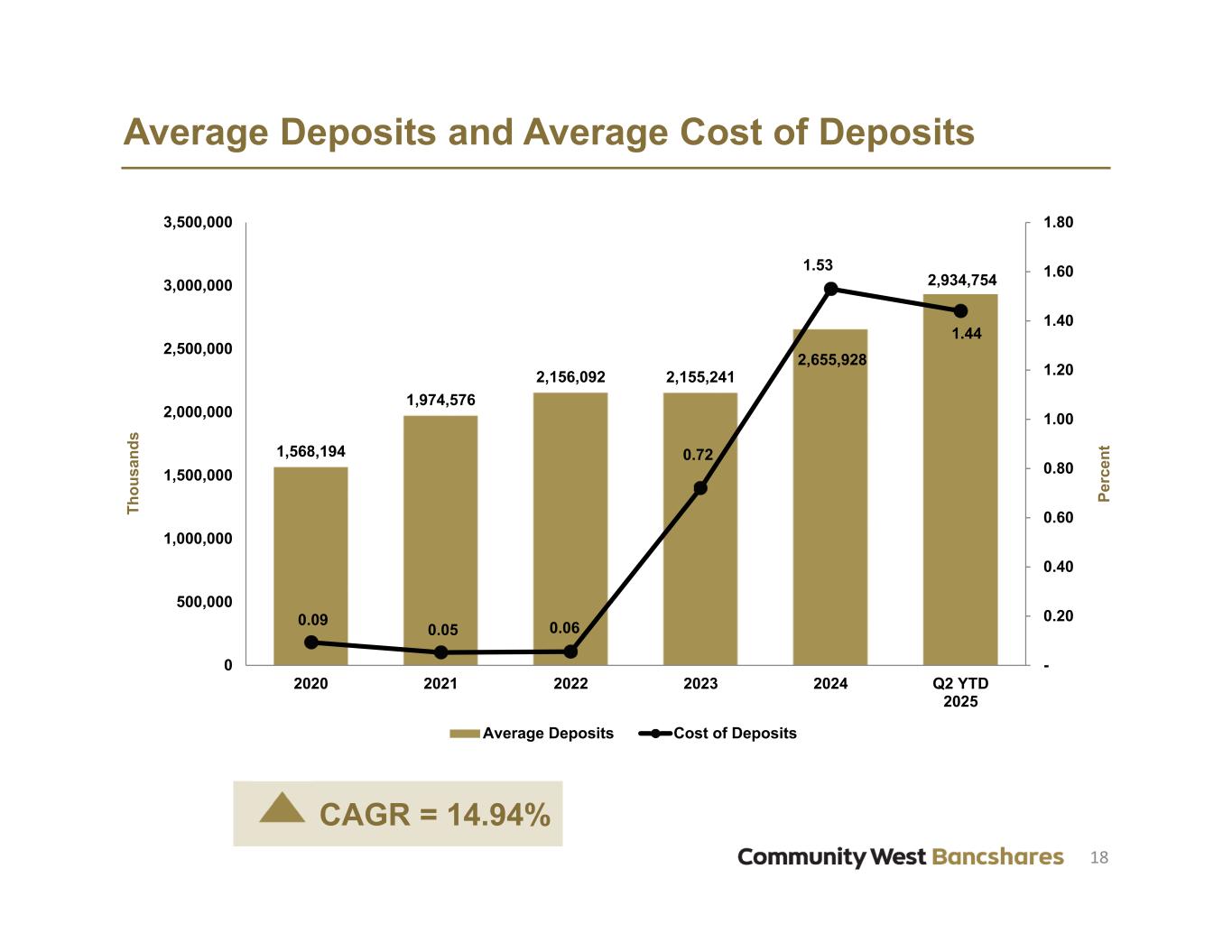 17 Deposit Mix Non-Interest Bearing 34% Now/Savings 21% Money Market 29% TCDs 16% As of June 30, 2025 Total Deposits = $3.0 Billion