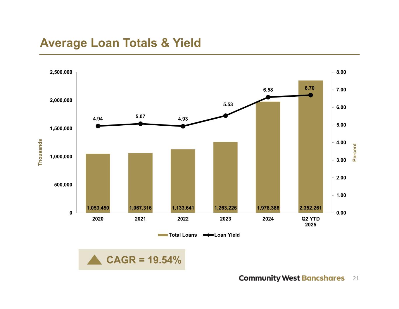 18 Average Deposits and Average Cost of Deposits CAGR = 14.94% 1,568,194 1,974,576 2,156,092 2,155,241 2,655,928 2,934,754 0.09 0.05 0.06 0.72 1.53 1.44 - 0.20 0.40 0.60 0.80 1.00 1.20 1.40 1.60 1.80 0 500,000 1,000,000 1,500,000 2,000,000 2,500,000 3,000,000 3,500,000 2020 2021 2022 2023 2024 Q2 YTD 2025 Pe rc en t Th ou sa nd s Average Deposits Cost of Deposits